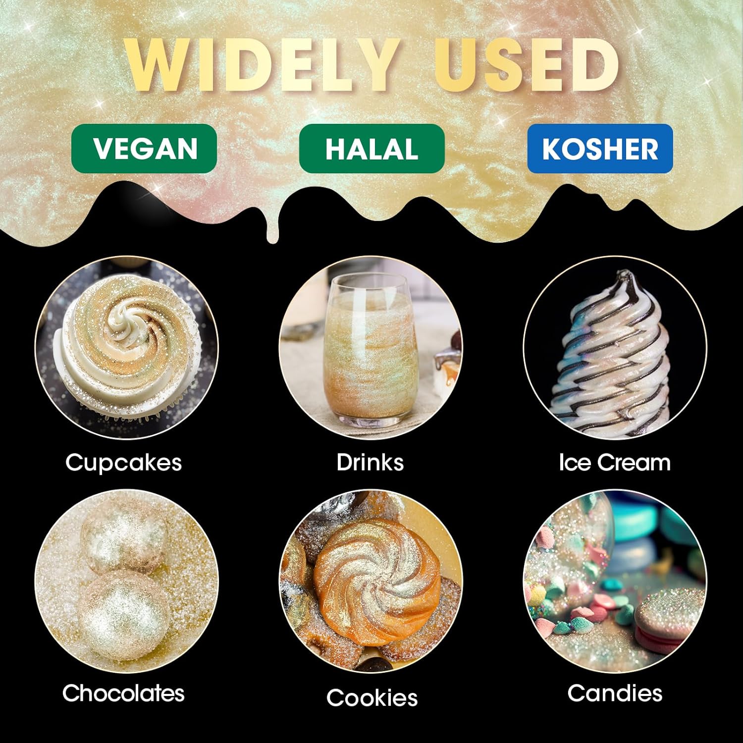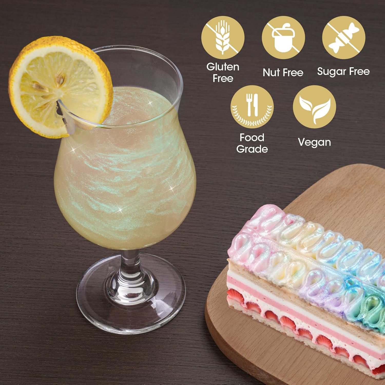 - ✔️【Vegan & Allergen-Free】Food-grade glitter uses only the highest quality vegan ingredients and does not contain common food allergens, including gluten, nuts or dairy products, so everyone can use and enjoy this product regardless of diet or food allergies. Unlike food contact glitter, these are 100% edible, so you don't need to worry about using them in your creations to make them sparkle for all.