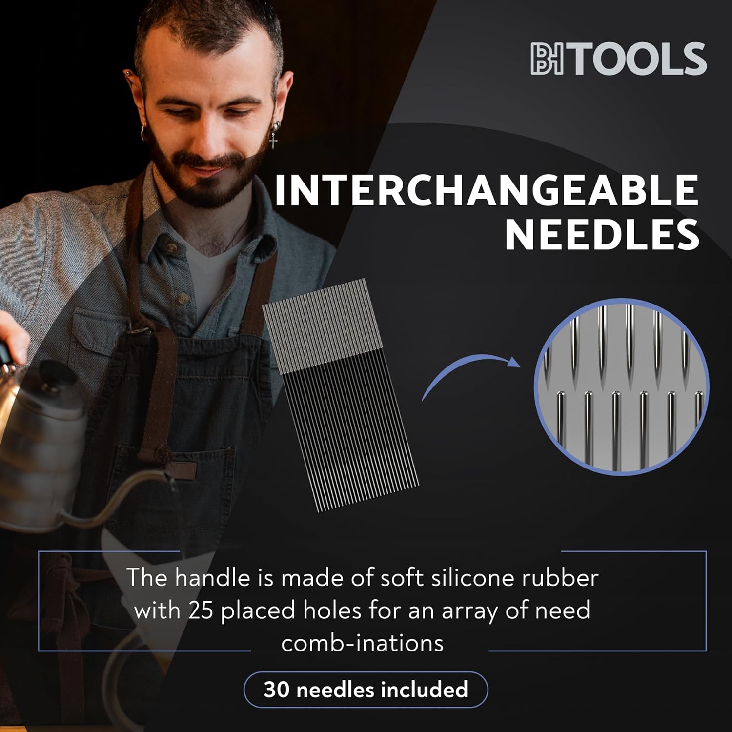 - INTERCHANGEABLE NEEDLES: The silicone rubber handle with 25 holes allows for an array of needle comb-inations. Includes 30 easily replaceable needles, ensuring you don't need to worry about bending a needle.