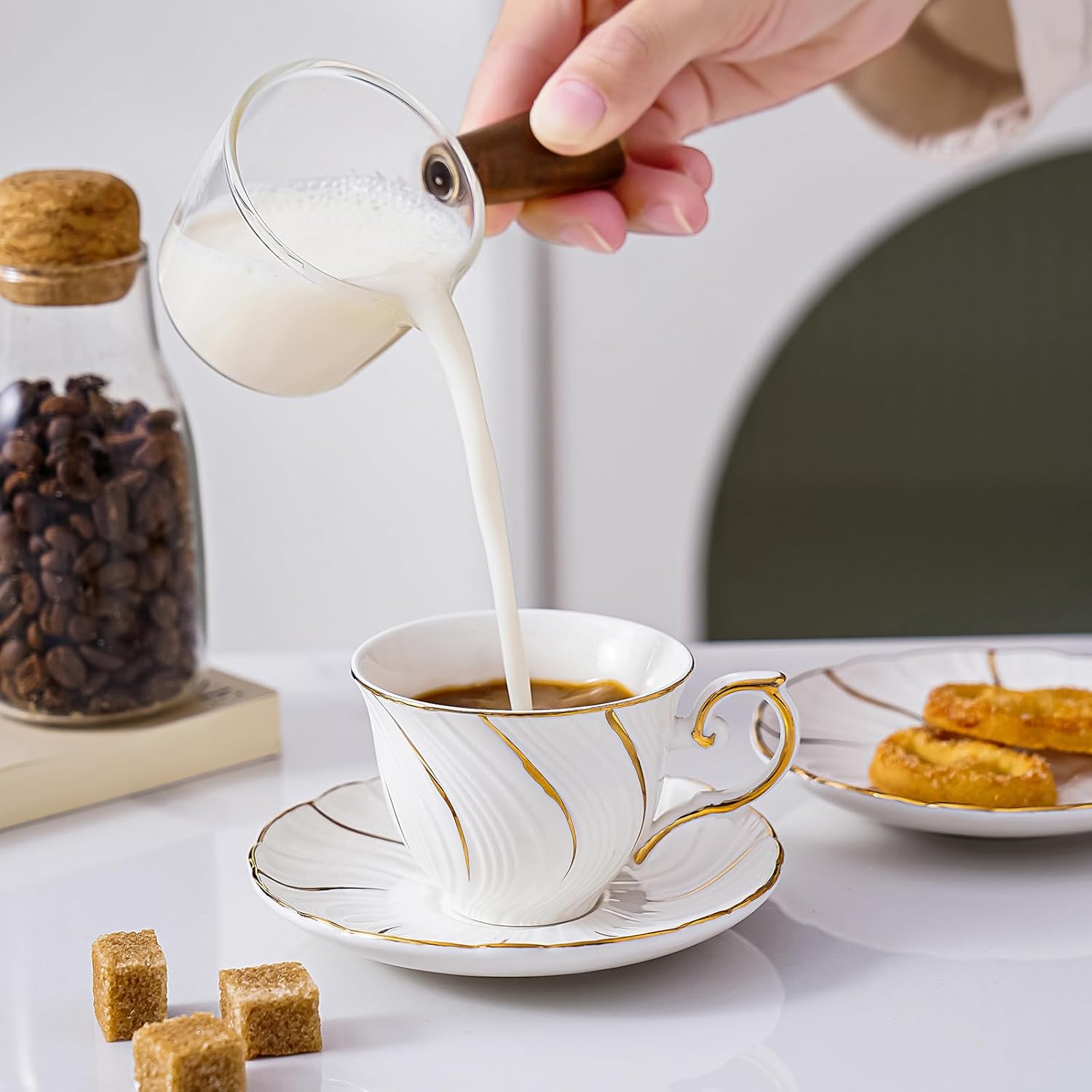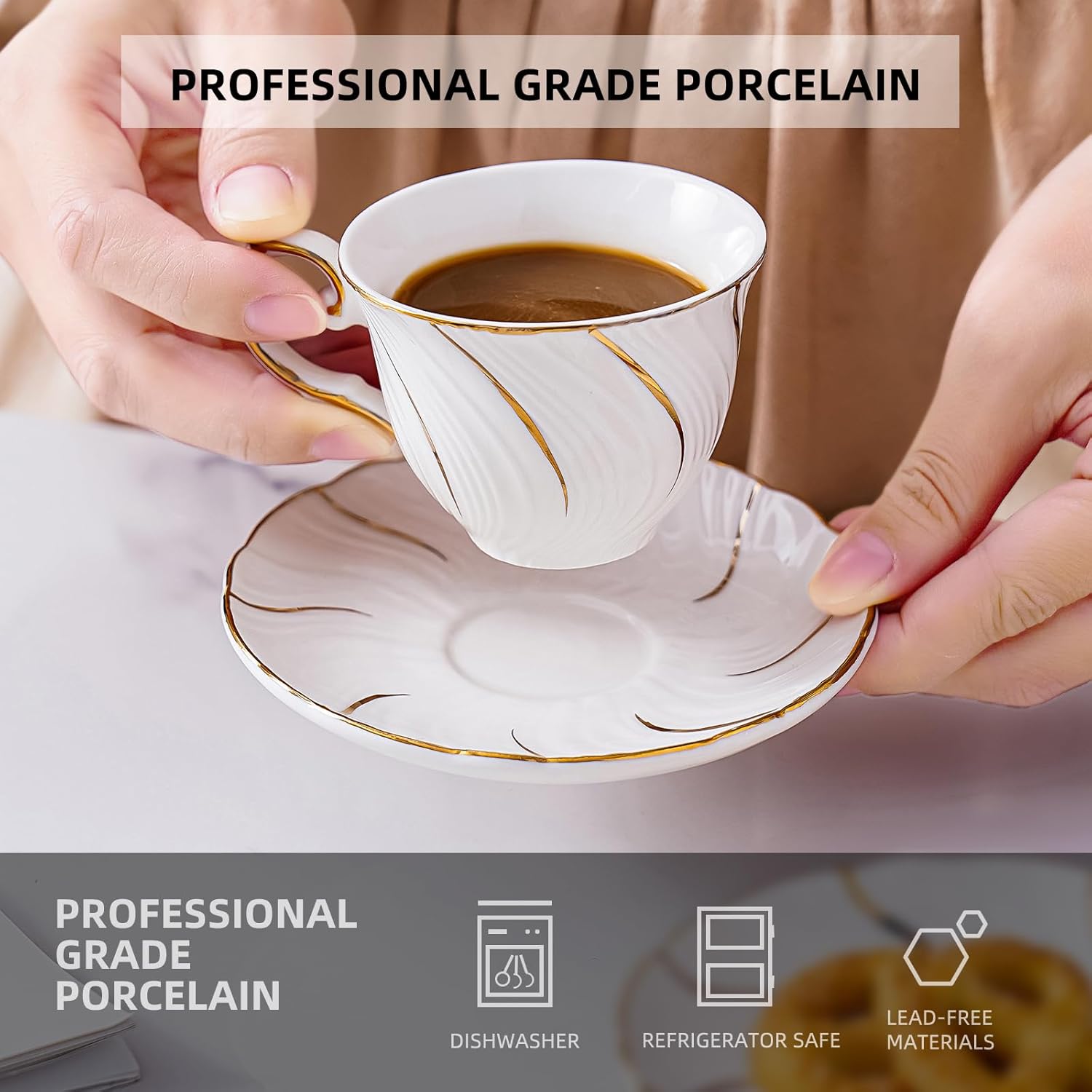 Ceramic Mini Espresso Cups Set of 4,3oz Espresso Mugs with Saucer,Porcelain Coffee Mugs Demitasse Cups, Modern Style cups for Latte, Cafe Mocha(4, White with gold thread)