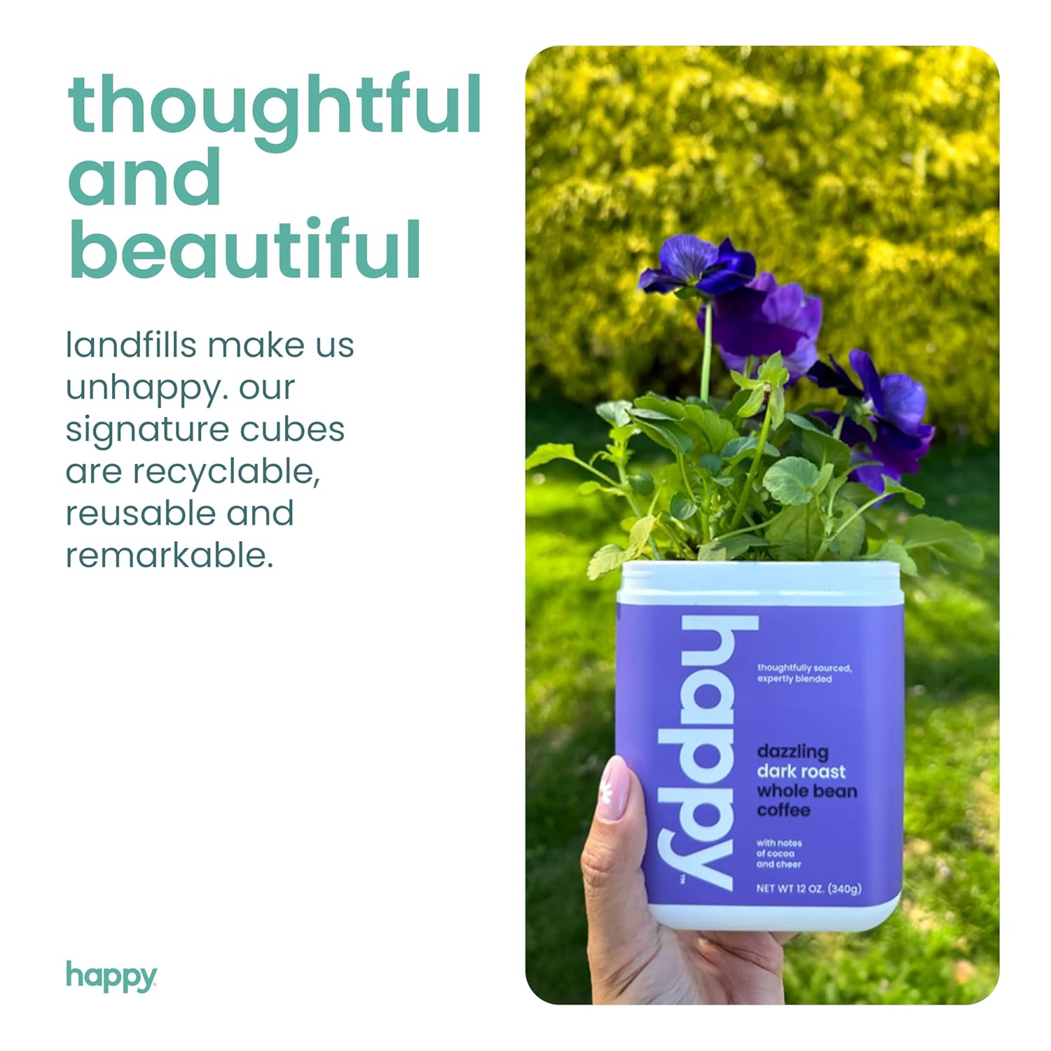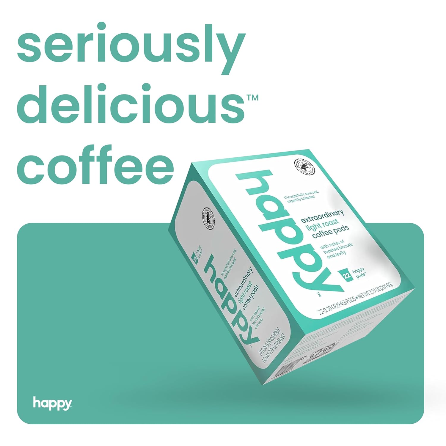 - seriously delicious: start your morning off right with happy’s extraordinary light roast coffee pods, thoughtfully sourced and expertly blended with notes of toasted biscotti and levity.