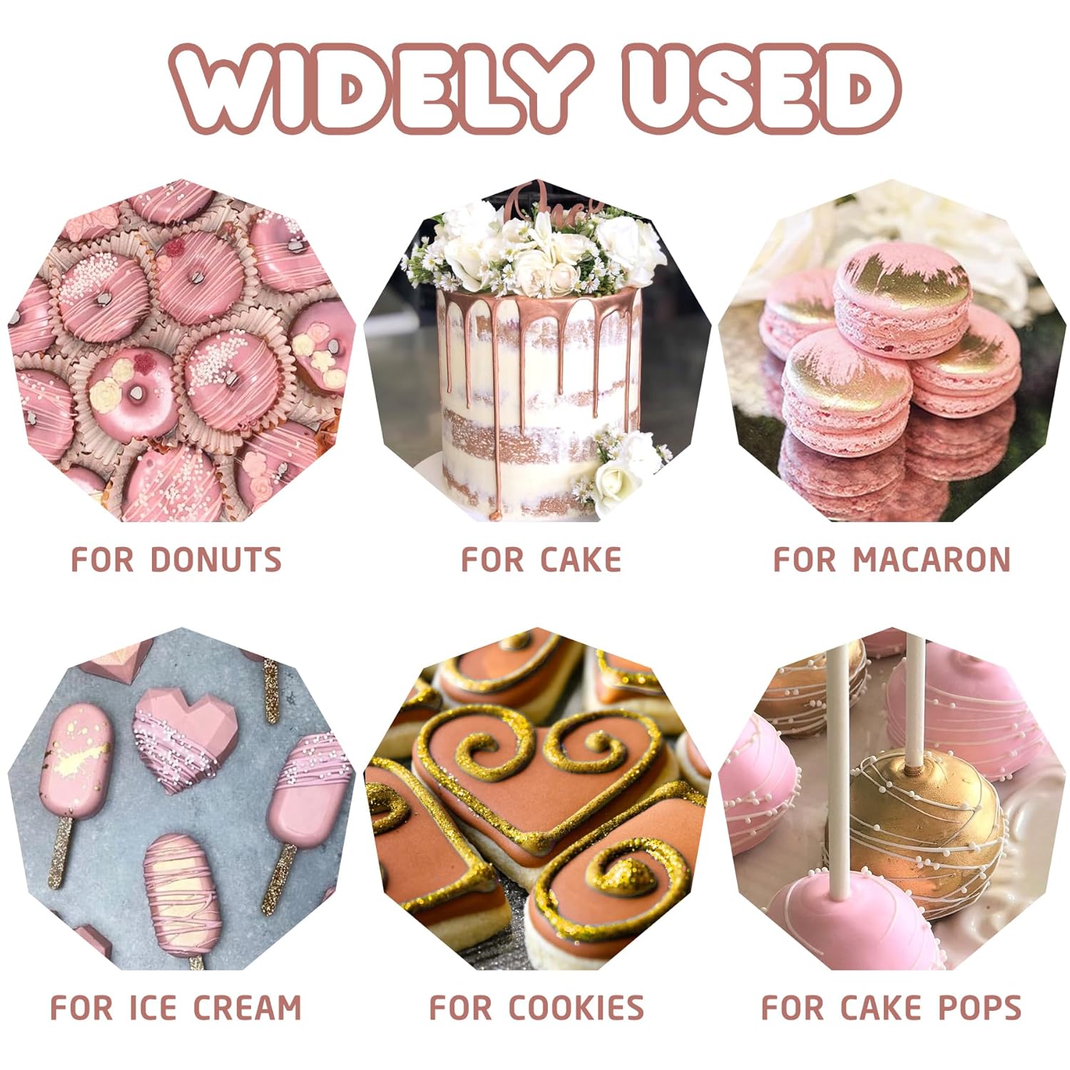 - METALLIC EDIBLE GLITTER PAINT - Specially crafted for food and baking decoration to get a metallic finish or add a gold-plated effect. All colors are brilliant and amazing. This fine texture edible cake paint can provide a high luster glitter effect to your cakes, chocolates, and candy!