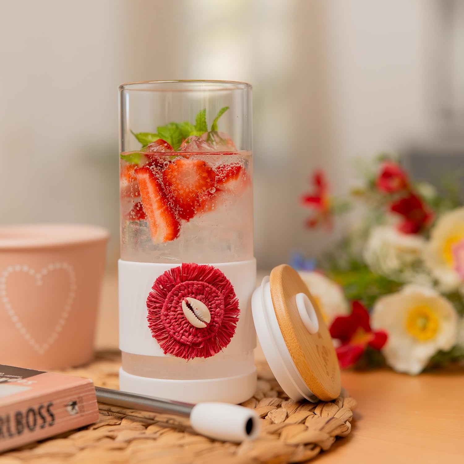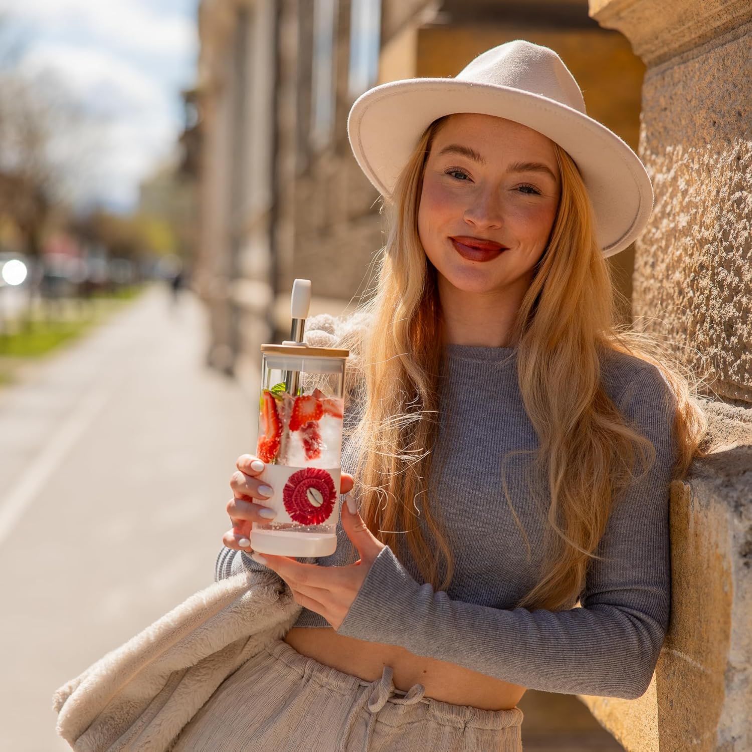 - THE ULTIMATE TRENDY GLASS TUMBLERS: These 20 Fl Oz Glass Cups With Lids and Straws are perfect for showing off your latest drink creations. The multiple components of the pack ensure a comfortable drinking experience and make them great as infusion Glass Tumblers for fruity drinks, Smoothies, Boba, or Iced Coffee Cups With Lids.