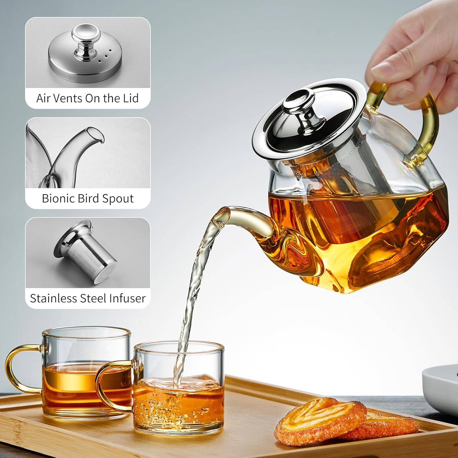 - Ergonomic Design: This glass teapot uses 304 stainless steel filter and bionic spout design. The high quality material ensures that the filter will not rust, and the bionic spout of the teapot will be smooth and not leak.