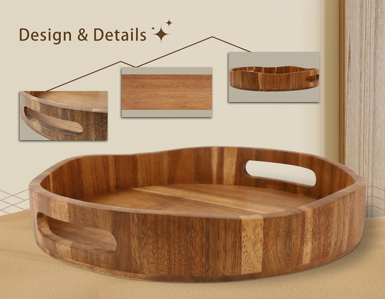 - [ Combining Nature and Quality ] - Crafted from 100% premium Acacia wood, known for its hardness, fine texture, and beautiful grain patterns. Throughout the manufacturing process, we pay attention to every craftsmanship detail to ensure the stability and durability of the product. The robust structure ensures it can bear the weight of items without compromising its functionality. The product undergoes meticulous polishing, and the handle is designed for a comfortable grip, ensuring it won't scratch you or your home. Please feel free to use with confidence.