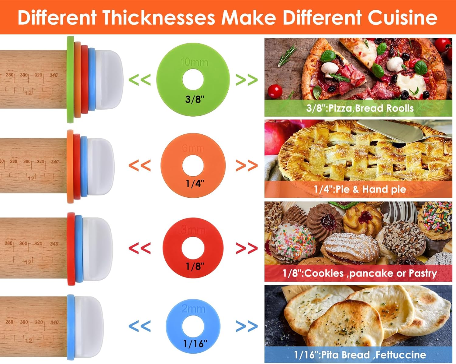 Rolling Pin with 4 Adjustable Thickness Rings and Long Handle 13.6 Inch Wooden Dough Roller for Baking, Dough, Cookie, Cake, Fondant, Pizza and Pie Crust