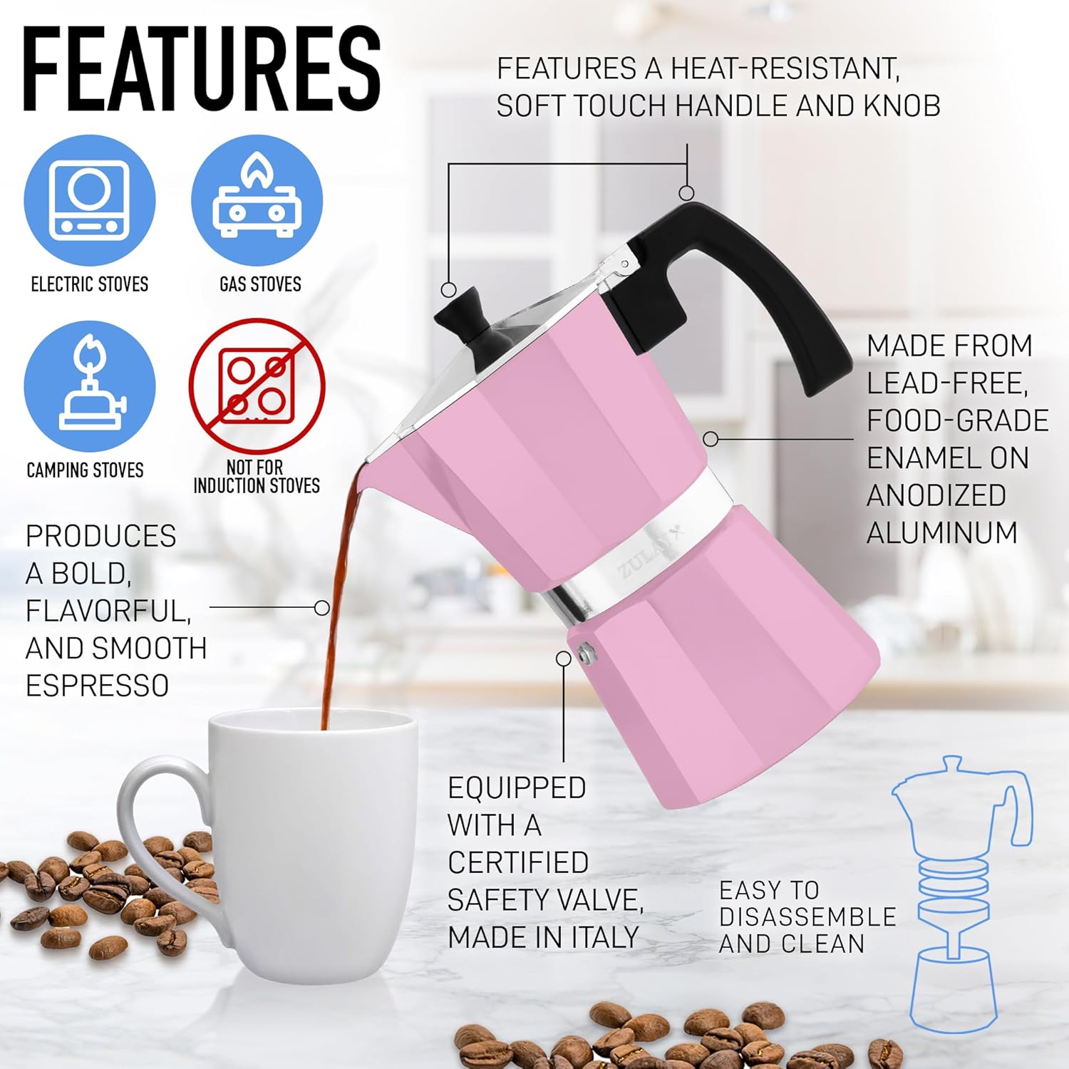 Zulay Moka Pot Espresso Stovetop Coffee Maker - Leak-Proof, Stainless Steel, Easy to Clean, Heat Resistant Handle & Knob - for Authentic Cuban & Italian Style Espresso - Makes 6 Espresso Cups - Pink