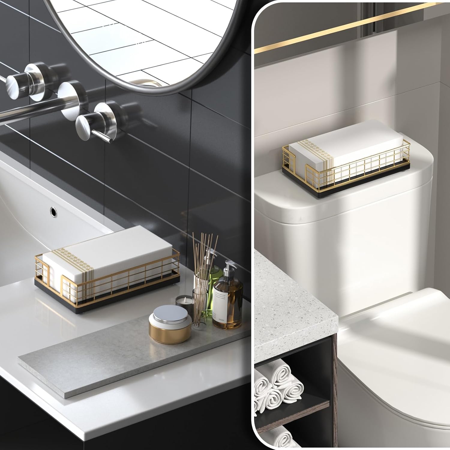 Wican Guest Towel Holder Tray for Bathroom, Oak and Iron Napkins Holder for Powder Room Dinning Table Wooden Basket for Disposable Paper Hand Towels Gold and Black