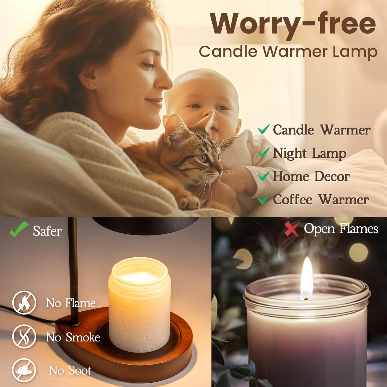 - Flame-Free Safe Candle Warmer: Innovative candle warmer lamp with timer offers a safe alternative to traditional candle burning. This candle lamp warmer provides a smoke-free and clean-burning experience, ensuring a fresh and healthy atmosphere in your home. The lamp candle warmer always delivers a warm and inviting glow, perfect for creating a cozy ambiance without the risks associated with open flames.