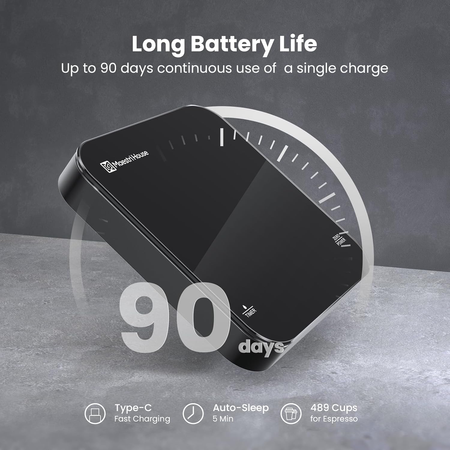 - 【Long Standby Rechargeable Battery 】The gram scale has a built-in 500 mAh lithium battery and a USB-C charging cable in the package. There is no need to replace or buy batteries; they can be used for up to 90 days on a single charge. The coffee scale will automatically enter sleep mode after 5 minutes of inactivity to save power