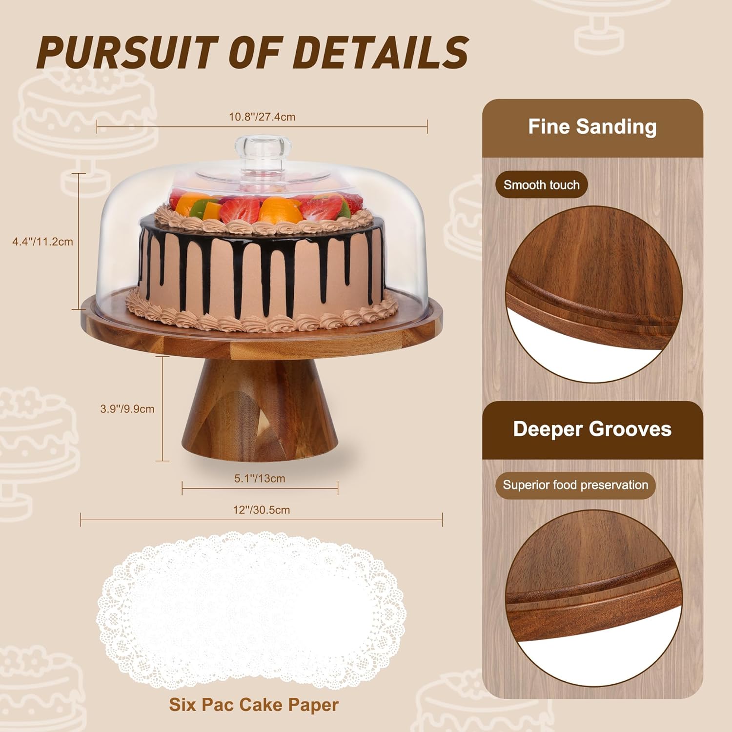 - 【Easy to Clean】Acacia wood is naturally resistant to stains and odors, making it an ideal choice for a cake stand with dome. You can confidently display a variety of desserts without worrying about stubborn stains. Our Acacia cake stand boasts a smooth surface that resists sticking, ensuring a hassle-free cleaning process. Simply wipe off crumbs and spills with a damp cloth, and it will look as good as new.