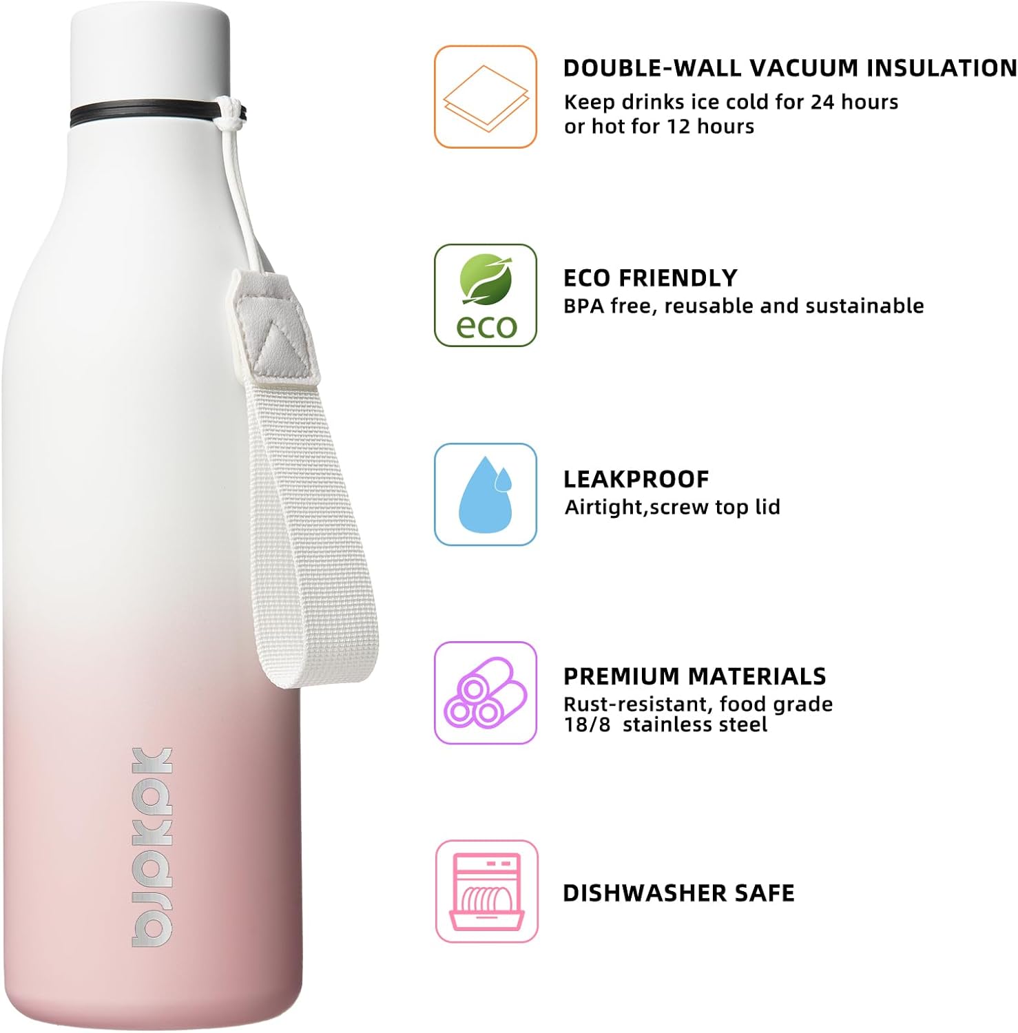 BJPKPK Insulated Water Bottles, 25 oz Stainless Steel Metal Water Bottle with Strap, BPA Free Leak Proof Thermos, Mugs, Flasks, Reusable Water Bottle for Sports & Travel, Graceful Pink