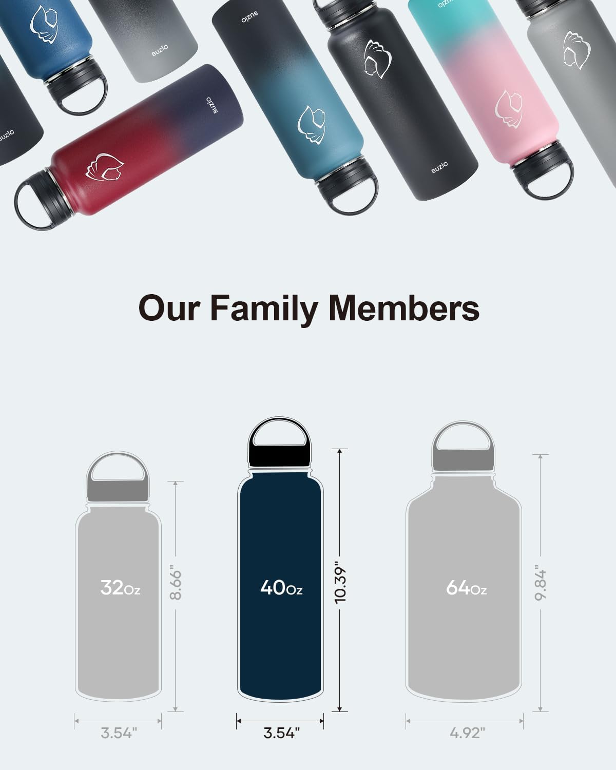 - There is Always One for you: BUZIO insulated water bottle meets your imagination in all aspects of drinking, from the comprehensive sizes (32oz-64oz) to classical and stylish designs, from the production materials to convenient accessories. Come to BUZIO, there is always one for you.
