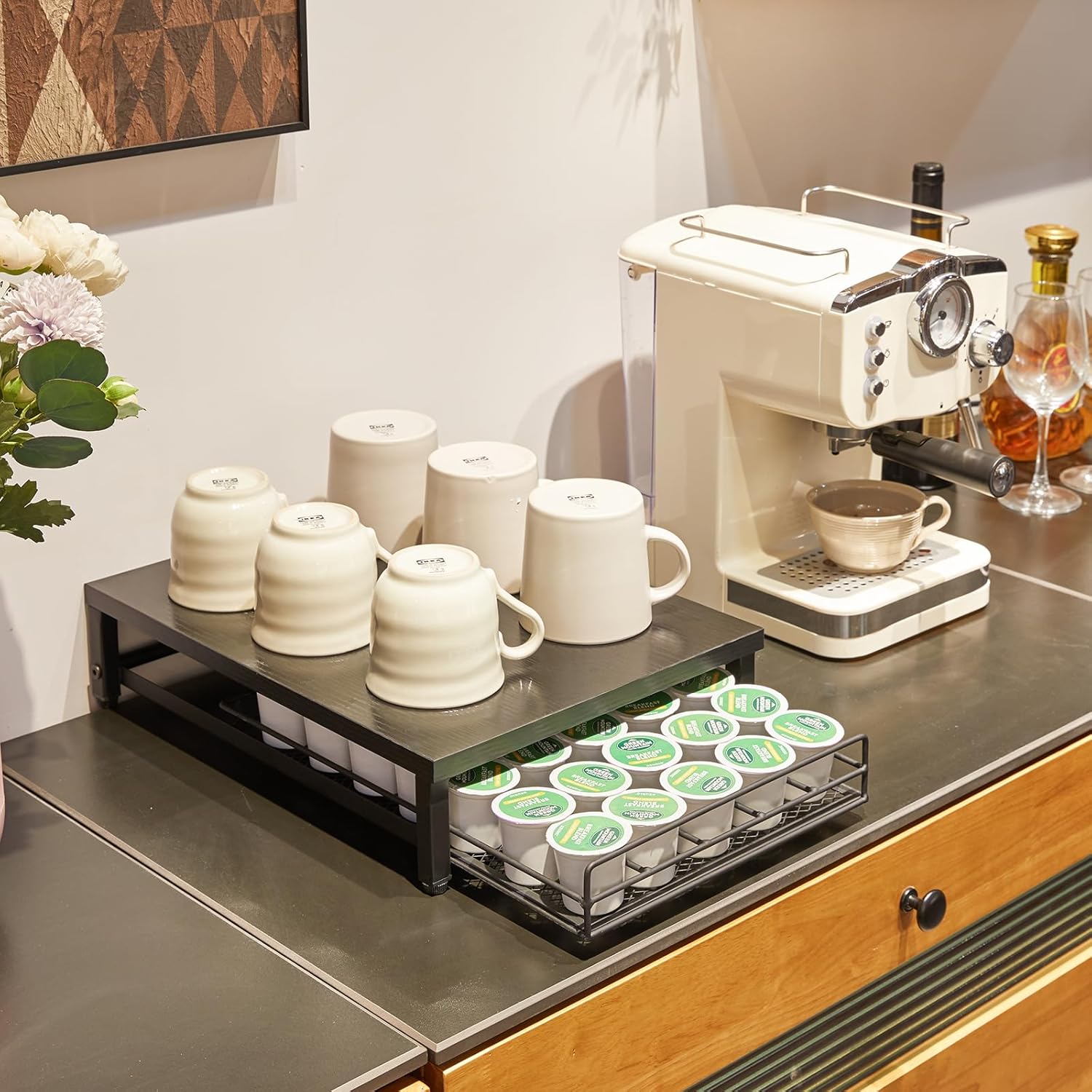 - 【EASY TO USE AND CLEAN】: The sliding drawer is easy to slide in and out, but it won't fall out on the floor. You can take out your coffee and enjoy it anytime. When the coffee station is dirty, just need to wipe.