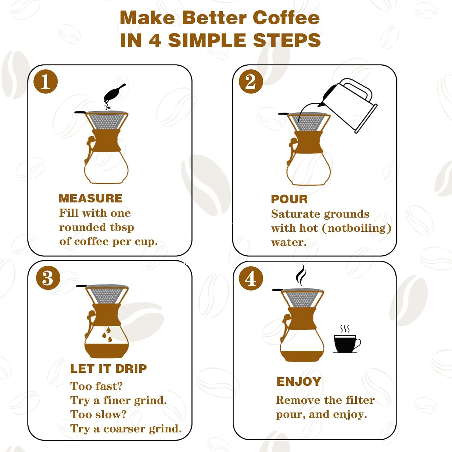 - 【STAINLESS STEEL FILTER】The filter of this handmade glass coffee maker is made of high-quality 304 stainless steel.It can be reused and does not require filter paper.It is more environmentally friendly and healthy.At the same time,the double-layer filter can effectively prevent the residue from falling into the pot,and the flow rate is more stable,no need to worry about the water flowing too fast or too slow.