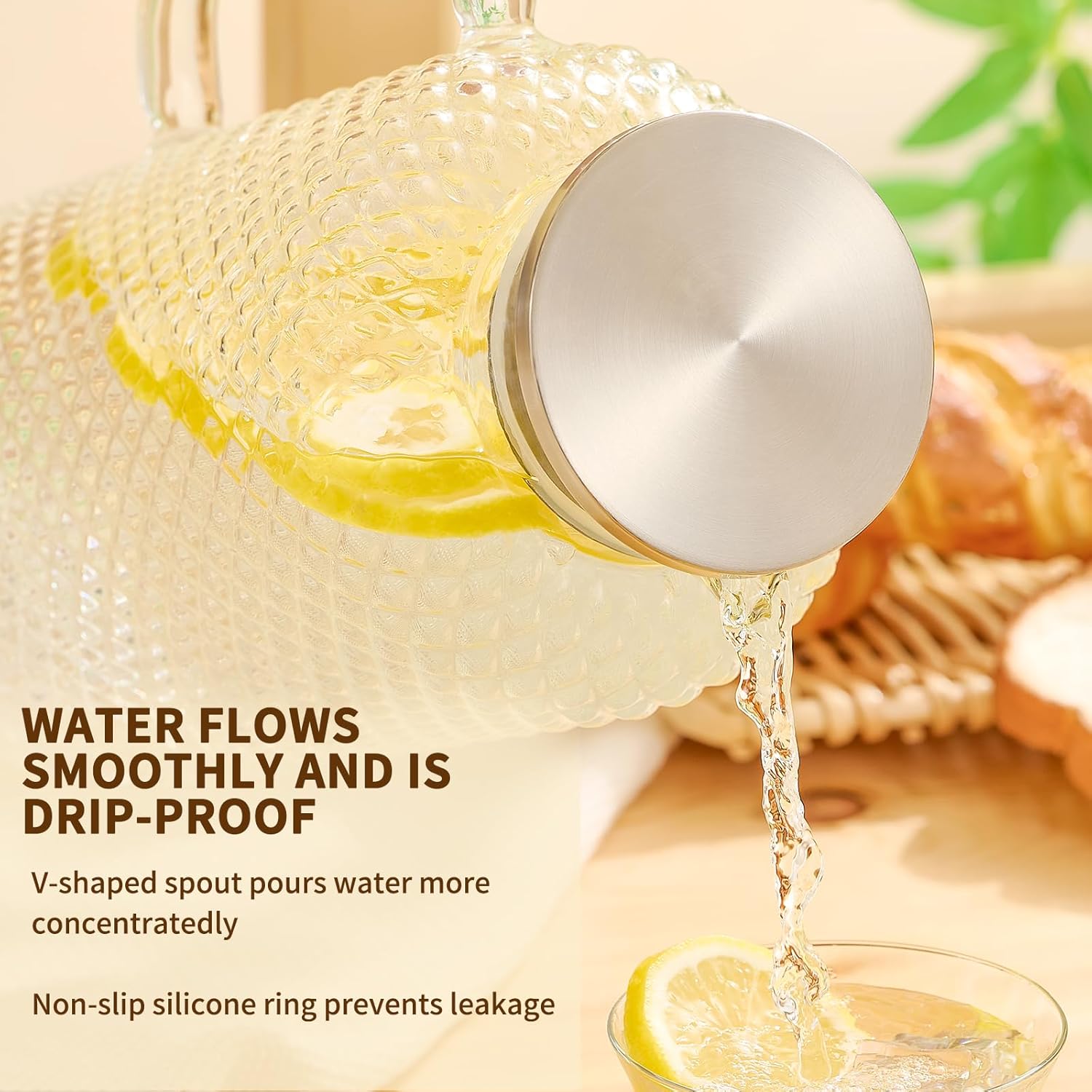 - [Safe and Sturdy Glass Material]: Our pitcher is crafted from premium high-grade borosilicate glass, ensuring it's 100% free of lead, heavy metals, and toxins. With a sturdy 3mm thickness, our pitchers are built to last, ensuring enduring durability.