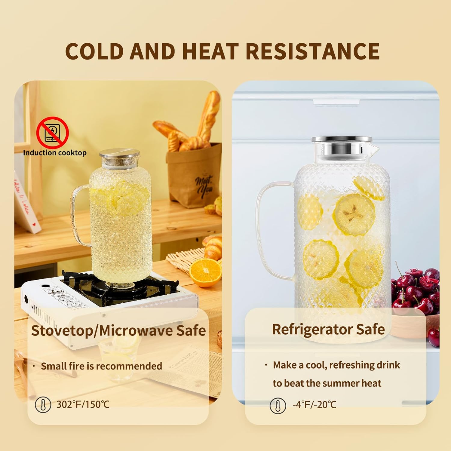 - [Temperature-Resistant Construction]: Our glass pitcher is designed to withstand high temperatures ranging from -4°F to 302°F, making it suitable for use on gas and electric stoves, as well as in refrigerators. You can safely pour boiling or ice water into it.