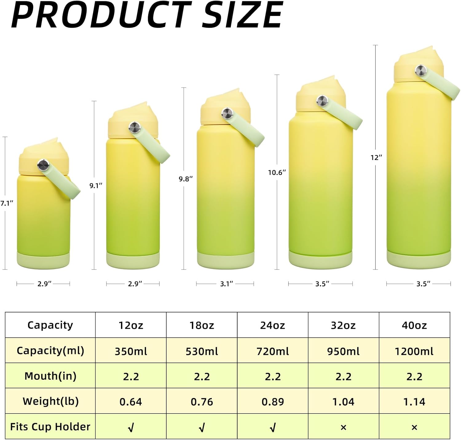 - MULTIPLE CHOICE & REUSABLE: Comes with multiple fashion colors and various sizes (12 oz, 18 oz, 24 oz, 32 oz, 40 oz) to choose from according to your need. 12 oz, 18 oz and 24 oz cups can put in your car cupholder. Get more out of your outdoor adventures with our reusable water bottle that can be refilled multiple times, reducing single-use plastic waste and promoting a sustainable lifestyle