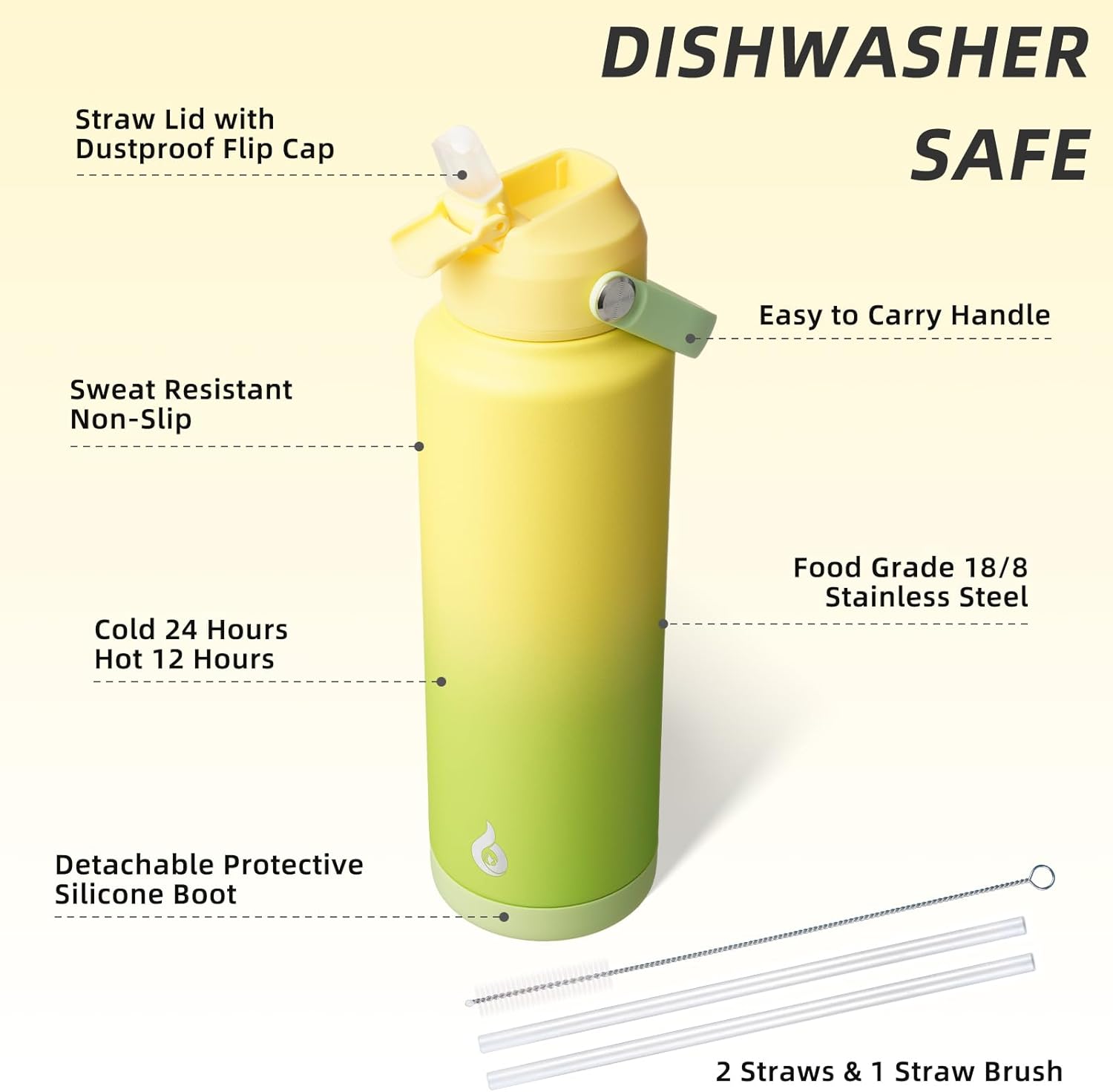- NON-SLIP PROTECTIVE BOOT & DISHWASHER SAFE: This stainless steel water bottle comes with a detachable silicone boot to protect the bottom from bump damage. The wide mouth design of our water cup allows for easy filling, pouring, and cleaning. With 2 straws and 1 straw brush, you can easily clean the nozzle and straw with straw brush. It is also dishwasher safe, saving you time and effort in maintaining its cleanliness and hygiene