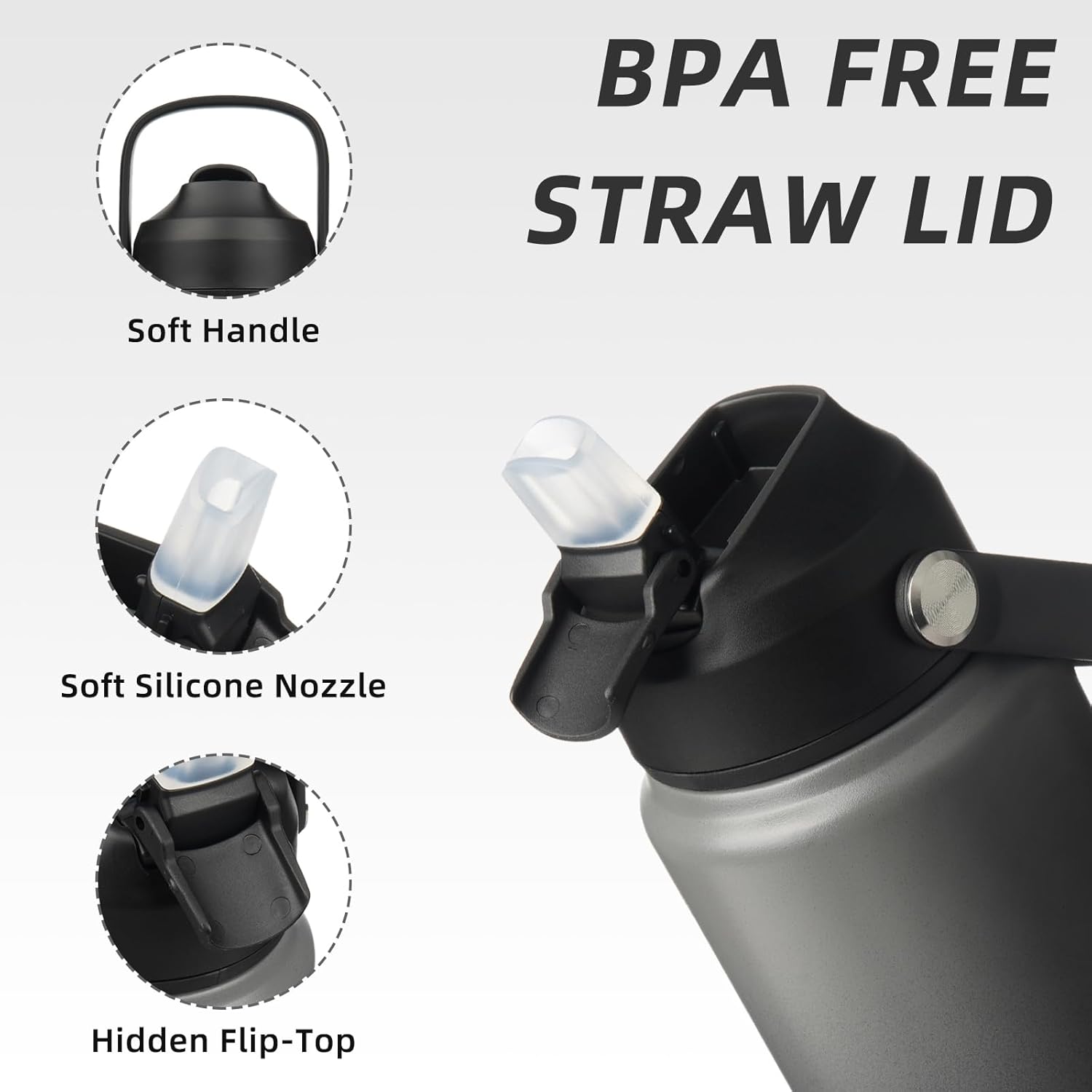 - INSULATED WATER BOTTLE WITH UPGRADED STRAW LID: BJPKPK insulated water bottle with straw lid use hidden flip-top Straw Lid to ensure open and close easily with one hand. The handle is soft and can freely rotate 180° for effortless carrying. Soft silicone nozzle will give you a better drinking experience. Upgraded hidden nozzle design can also keep the nozzle clean and ensure leakproof when it closed