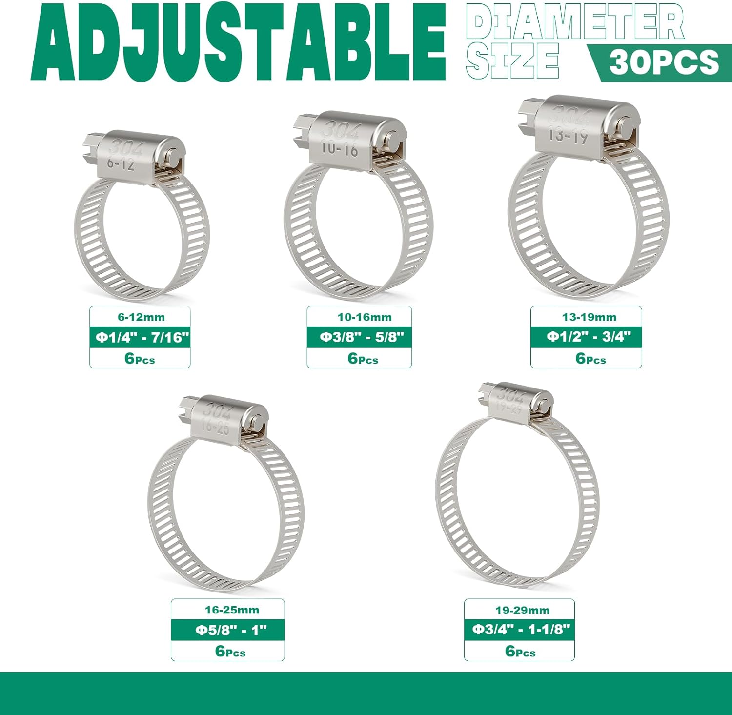 - 30PCS(5Sizes) Hose Clamp Kit —Thickness of 1/4".Including 6pcs 1/4-7/16"(6-12mm),6pcs 3/8-5/8"(10-16mm),6pcs 1/2-3/4"(13-19mm),6pcs 5/8-1"(16-25mm),6pcs 3/4"–1-1/8"(19-29mm) with socket wrench,you don't need to buy extra one