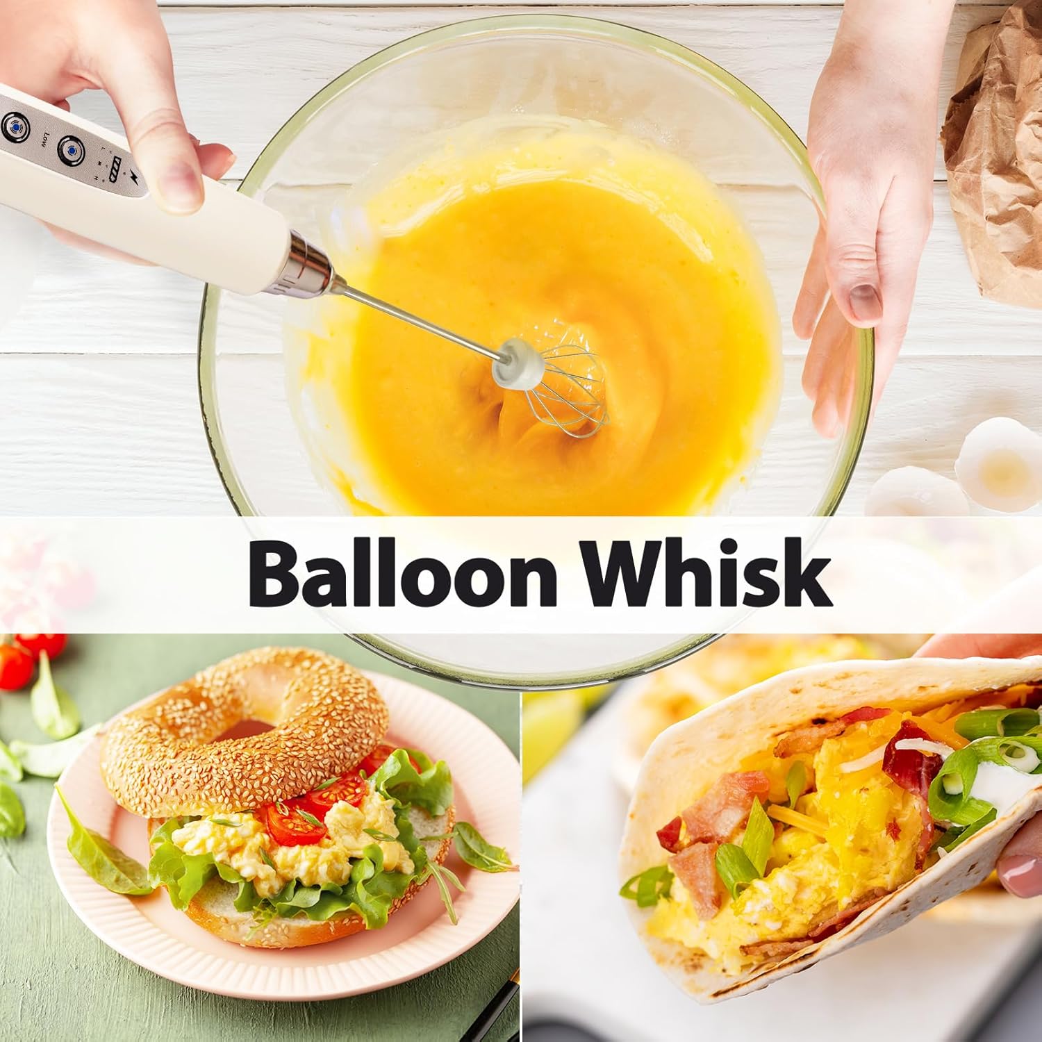 - 【3 Whisks, Use Anywhere You Need】: 3 interchangeable multifunctional whisks: Spring Whisk for milk and coffee froth for delicious drinks; Ball Whisk for whisking eggs and whipped cream; Hook Whisk for mixing powders, making jam.