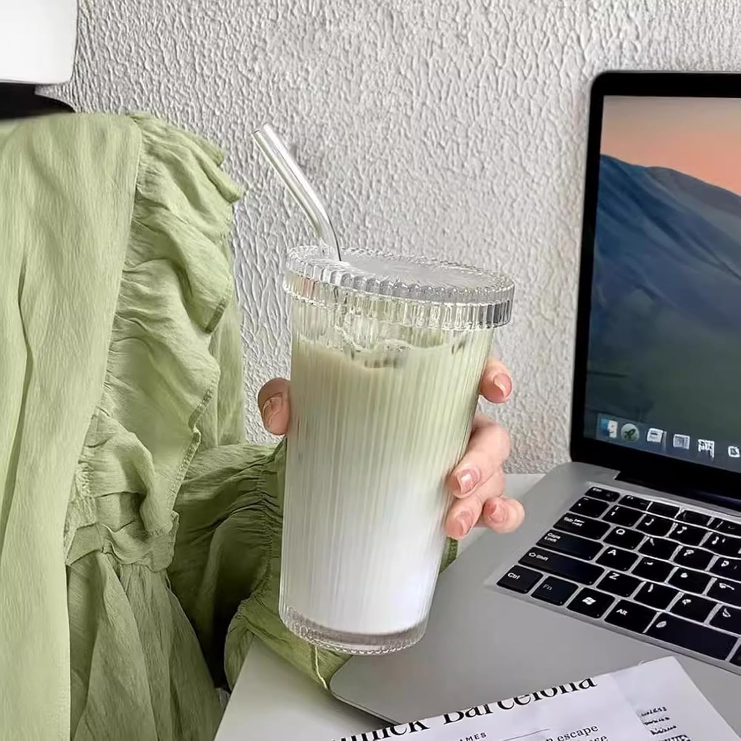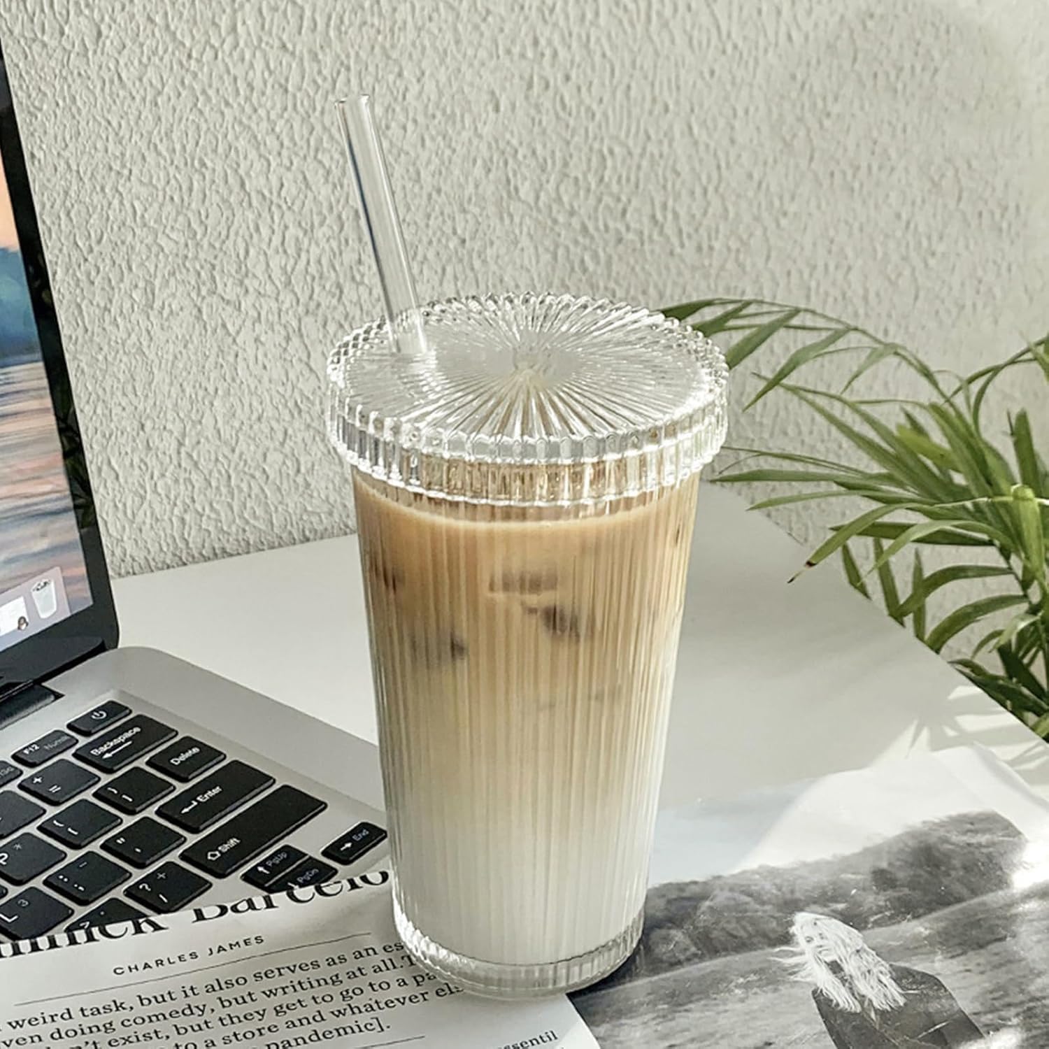 13oz Clear Iced Coffee Cups with Lids, Clear Glass Tumbler with Straw & Lid, Ribbed Glassware Cups, Dishwasher Safe Drinking Glasses, Stylish Glass Cups for Coffee, Juice, Tea, Matcha