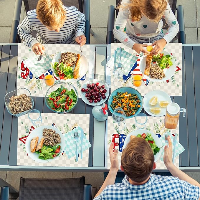 - Multipurpose uses: These wipeable 4th of July table placemats are ideal for a wide range of occasions, including, 4th of July party, patriotic parties, Memorial Day family gatherings, picnics, barbecues, and both indoor and outdoor events, adding a touch of cheerfulness and festival to your party atmosphere.