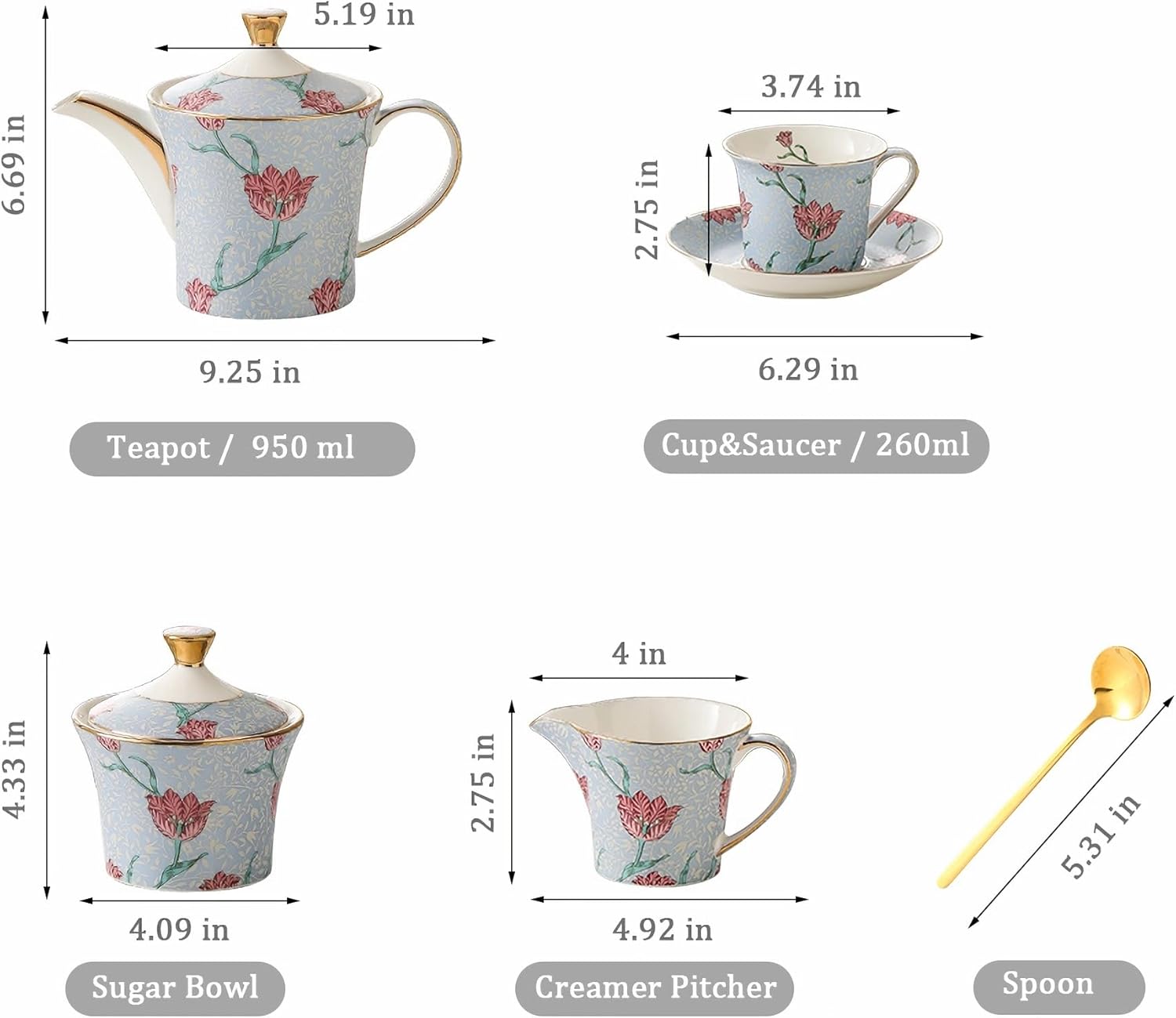 - Bone china tea set for 6 -- Our tea set contains: 1 teapot(37 OZ), 1 sugar bowl, 1 creamer, 6 cups(6.7 OZ), 6 saucers, 6 teaspoons. You can enjoy a delicious afternoon tea with your friends on a pleasant weekend and have a great time together!
