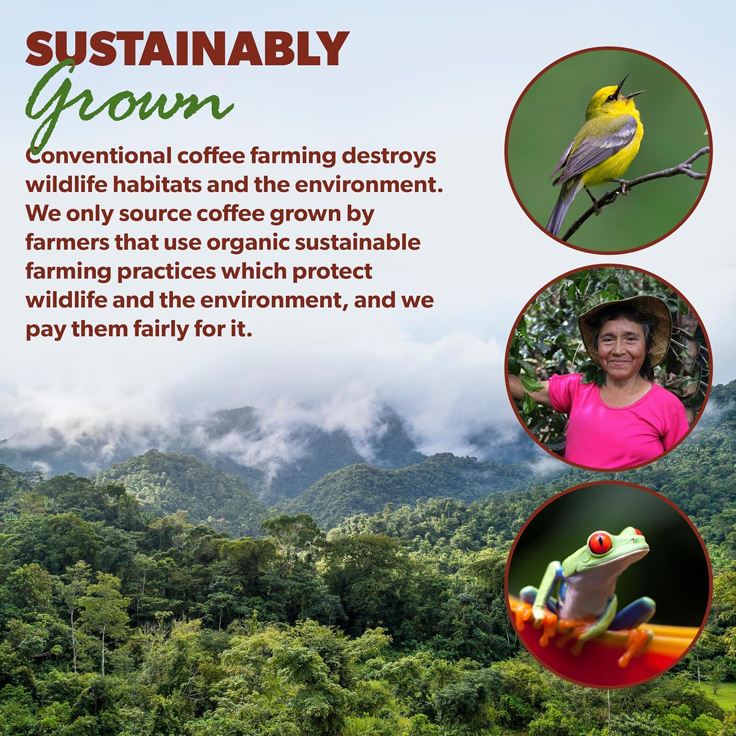 - Peace of Mind! Our coffee is grown by socially and environmentally responsible farmers. They treat their workers well and protect native species habitats.