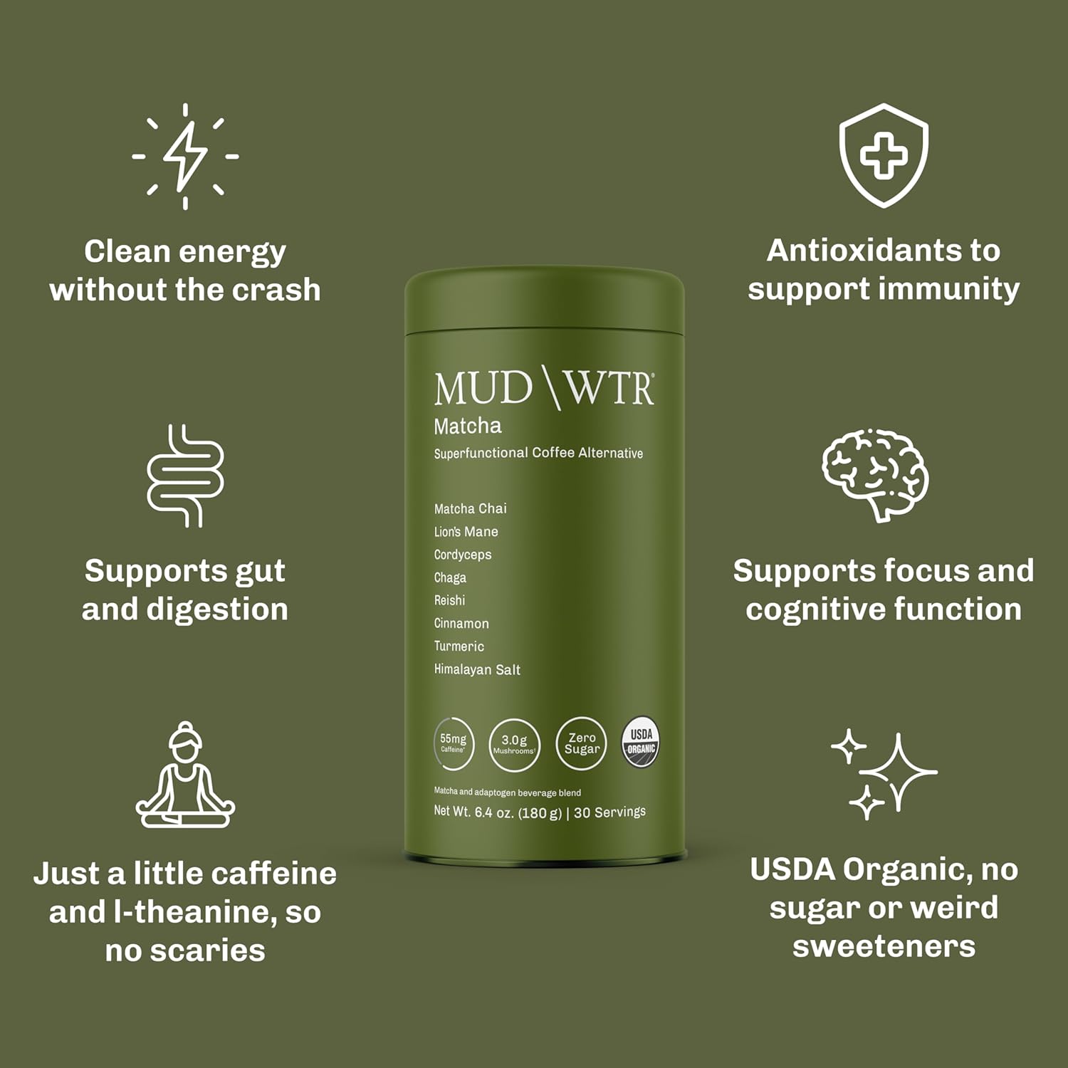- WHAT THE HECK IS MUDWTR MATCHA - It's not a mushroom coffee. It's not a mushroom tea. MUDWTR Japanese Matcha blend is a different kind of powder-based, beneficial mushroom drink that gives you focus, sustained energy and immunity support. MUDWTR doesn't dissolve easily in water, but that's what happens when using high quality, all-natural ingredients & ZERO artificial additives! If you're looking for productivity with more peace of mind, this is the drink for you.
