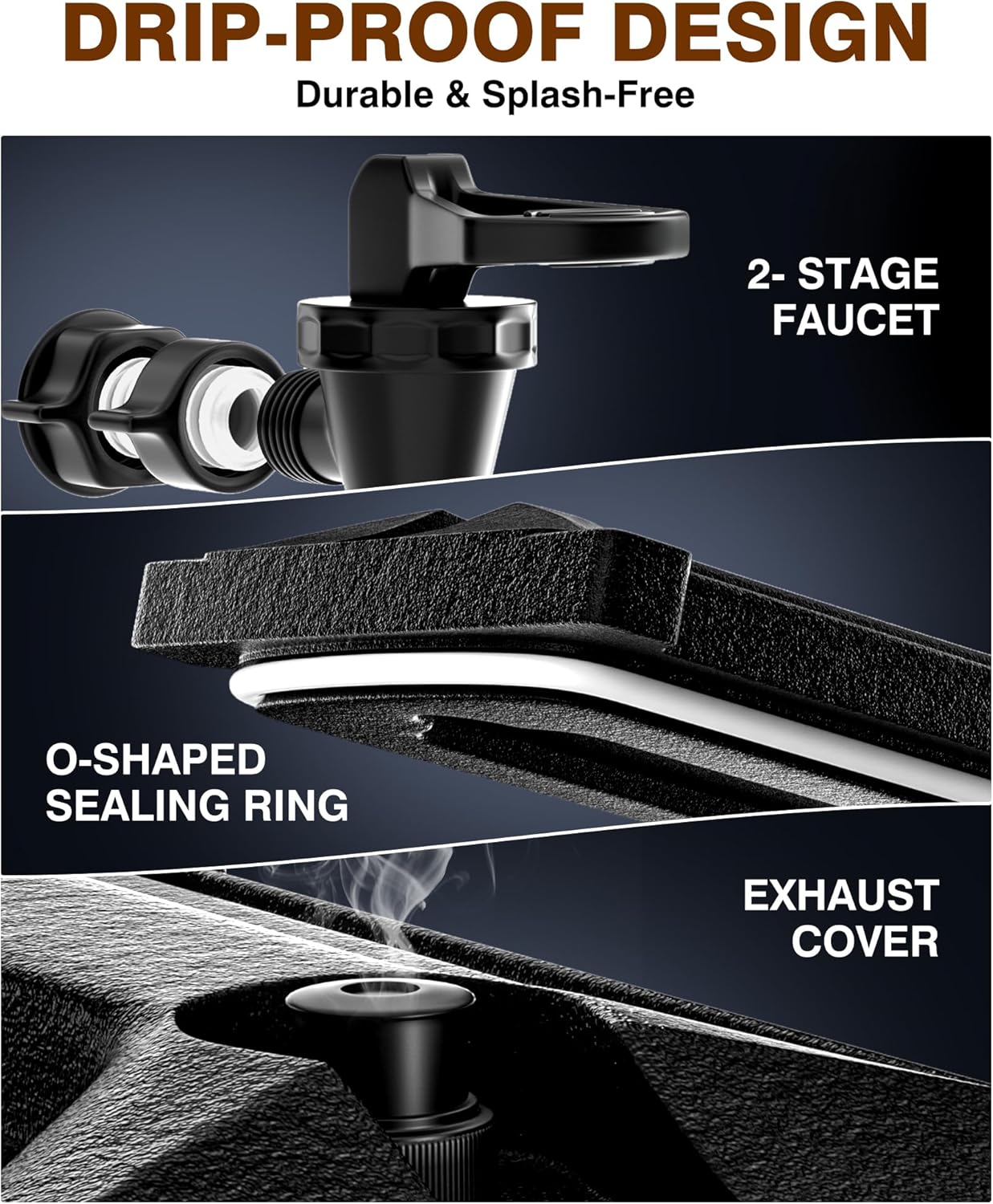 - DRIP-PROOF AND LEAK-PROOF DESIGN:Experience worry-free beverage retrieval with our hot drink dispenser professionally designed drip-proof and leak-proof features. From the double-layered faucet and O-ring sealed strip to the intelligent exhaust cover, your drinks are guaranteed not to leak or splash, making retrieval effortless and stress-free.Please do not fill with liquid exceeding 2.5GL to prevent the liquid from leaking out of the vent hole
