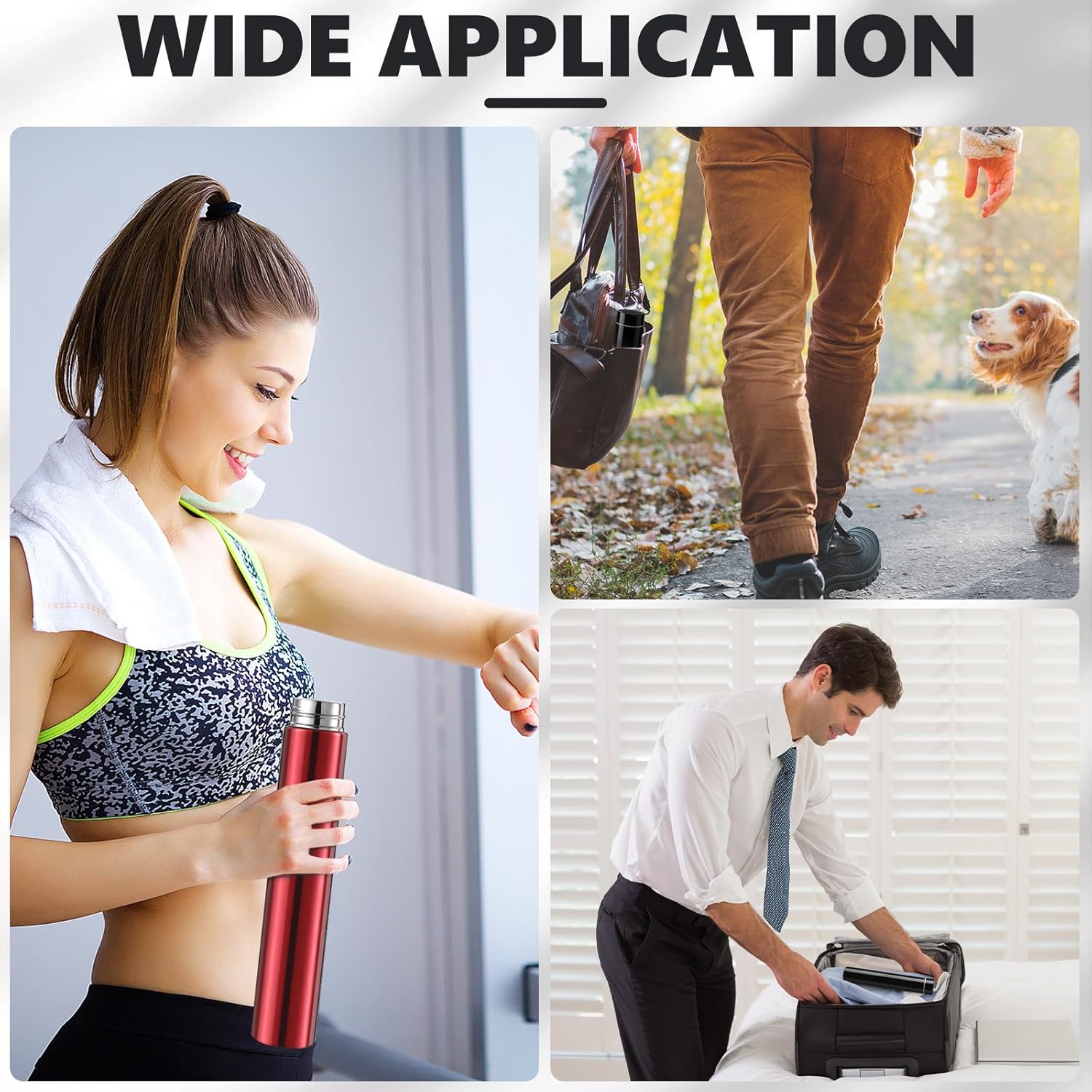 - Wide Applications: the slim water flask is wide application, you can use the purse water bottle for taking meds, having a doctor's appointment, having an emergency drink, eating outside, taking a short hike, walk, trips, going to the movie theater, bicycling, running, yoga, golf, camping, short errands, going to the gym, meetings, business trips, and more
