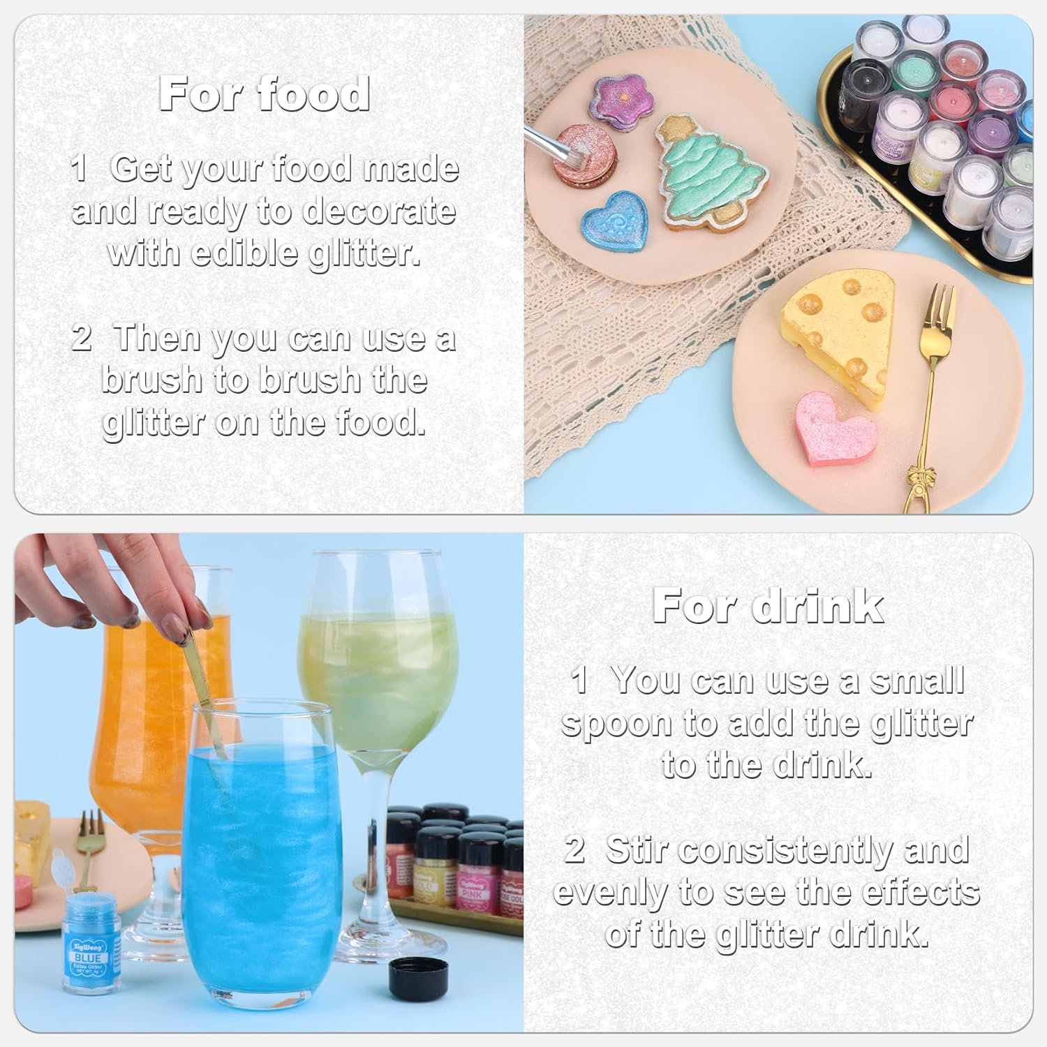 - 【Edible Glitter】: We offer edible glitter in a variety of colors, so you can match them to your party theme or personal preference to add a gorgeous shine to your drinks or baking!
