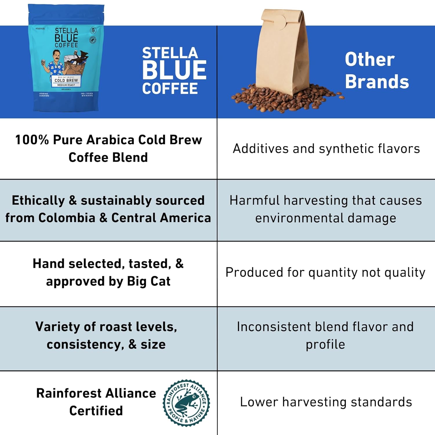 - BIG CAT'S SEAL OF APPROVAL: Every Stella Blue blend is personally approved by Big Cat to meet exacting standards in taste, aroma, and overall experience. We don’t just put his name on the label—he stands behind every cup. If your cold brew isn’t everything you hoped for, let us know. We’re committed to getting it right, because coffee this good deserves your full satisfaction.