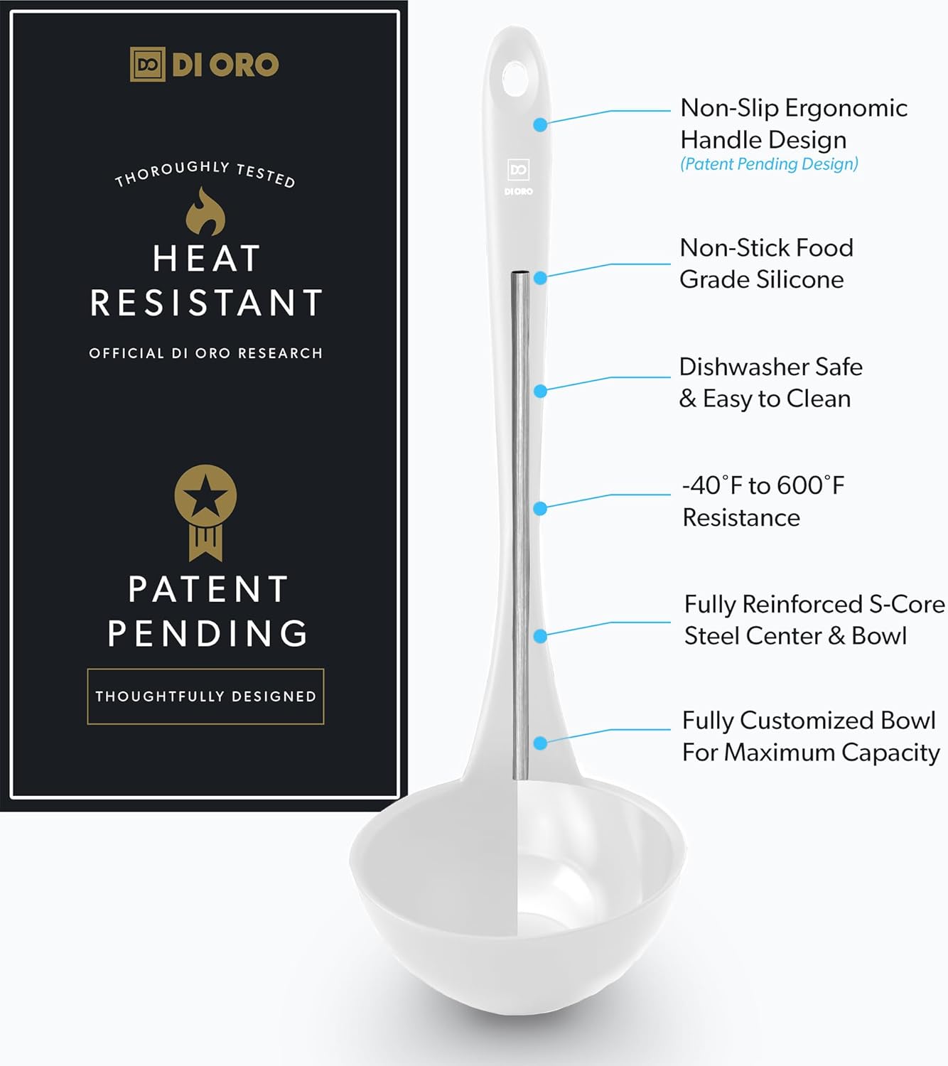 - THOUGHTFUL AND CREATIVE DESIGN – Measuring at a length of 12.5”, constructed with a strong and durable stainless-steel core, and designed with optimum bowl capacity, the DI ORO Silicone Ladle is built to handle stirring, serving, and other tasks in your kitchen with ease. Our 600°F heat-resistant velvety smooth handle will not melt and will fit like a glove in the palm of your hand.
