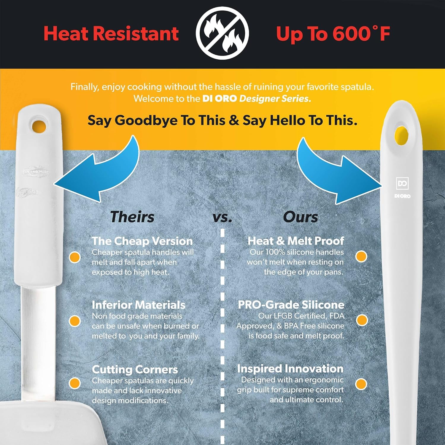 - ONLY THE BEST – By popular demand, we have added a Silicone Ladle to our Award-Winning Seamless Series line of kitchen utensils. The Di Oro Seamless Series Ladle is made with food grade, BPA Free, and LFGB Certified Silicone. Built to withstand the heat, this ergonomically designed tool is heat-resistant up to 600°F, which means you will never melt your favorite kitchen utensil.