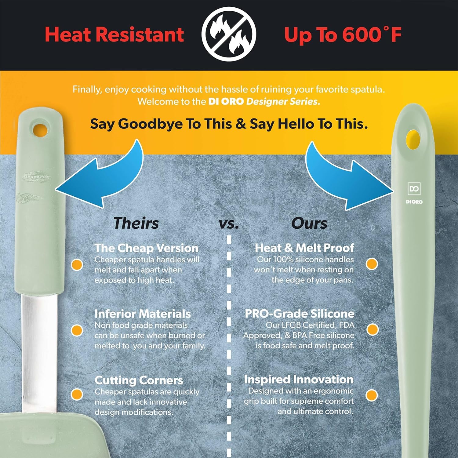 - THOUGHTFUL AND CREATIVE DESIGN – Measuring at a length of 12.5”, constructed with a strong and durable stainless-steel core, and designed with optimum bowl capacity, the DI ORO Silicone Ladle is built to handle stirring, serving, and other tasks in your kitchen with ease. Our 600°F heat-resistant velvety smooth handle will not melt and will fit like a glove in the palm of your hand.