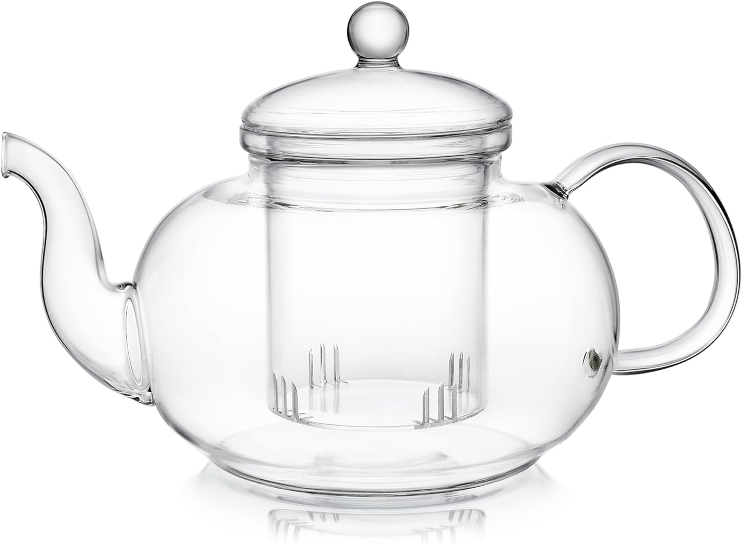 - NON-POROUS BOROSILICATE GLASS TEAPOT & INFUSER - Lead-free borosilicate glass is prized for its ability to resist extreme temperature changes. Its wider shape gives you the perfect viewing area to watch flowering teas unfurl or you can insert the included glass tea infuser with your own loose tea leaves.