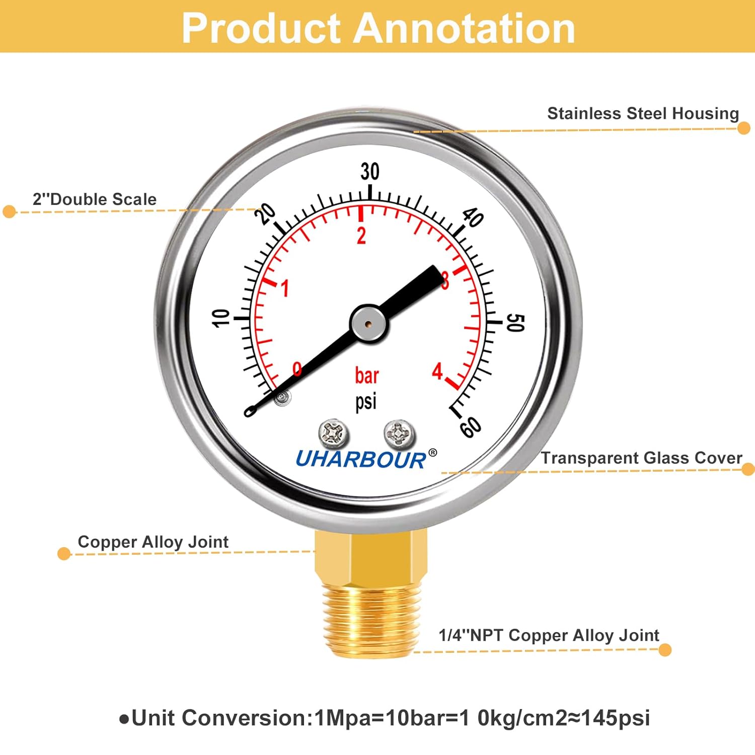 Lead-Free Water Pressure Gauge Liquid Filled 60 Psi 2" Dial, Stainless Steel Case, 1/4" NPT Lower Mount, Water Pressure Gauge for Home