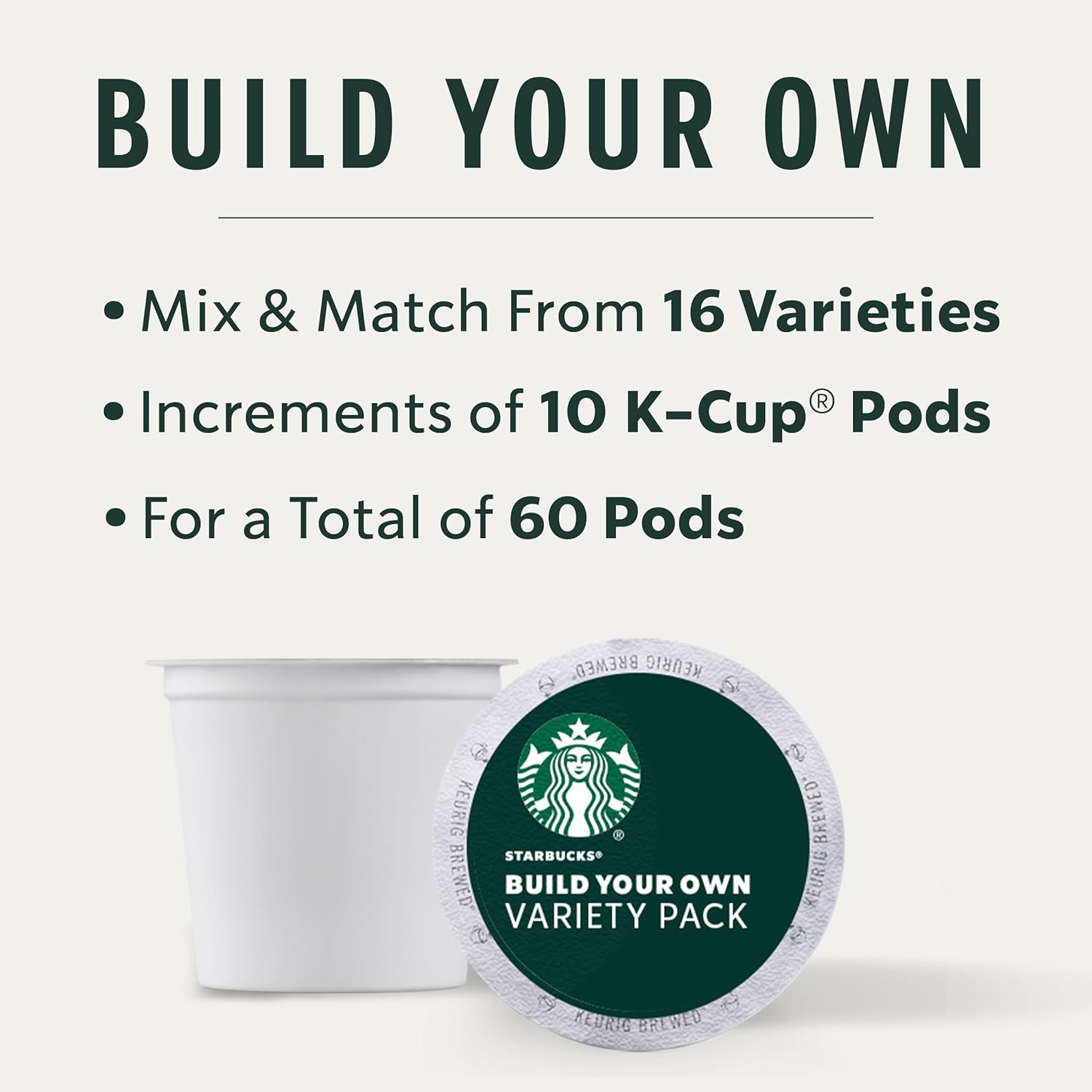 - BUILD YOUR OWN VARIETY PACK: Sip your way to delicious with this build-your-own K-Cup pod variety pack. Mix and match from 15 different varieties of Starbucks coffees in increments of 10 pods to create your own personalized variety pack of 100 K-Cup pods