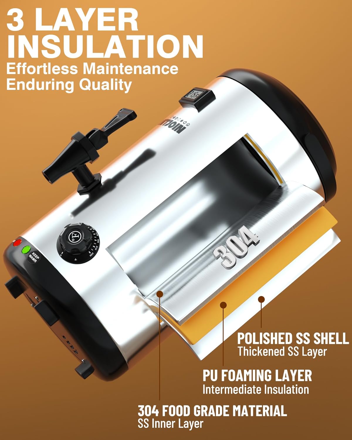 - OUTSTANDING INSULATION: Featuring electric heating, this double walled stainless steel electric beverage dispenser maintains your drinks at set temperatures for long periods. With its polyurethane insulation and double-layered lid, even without power, heat loss is minimized, ensuring your coffee, tea, and hot chocolate keep perfectly warm or cold.