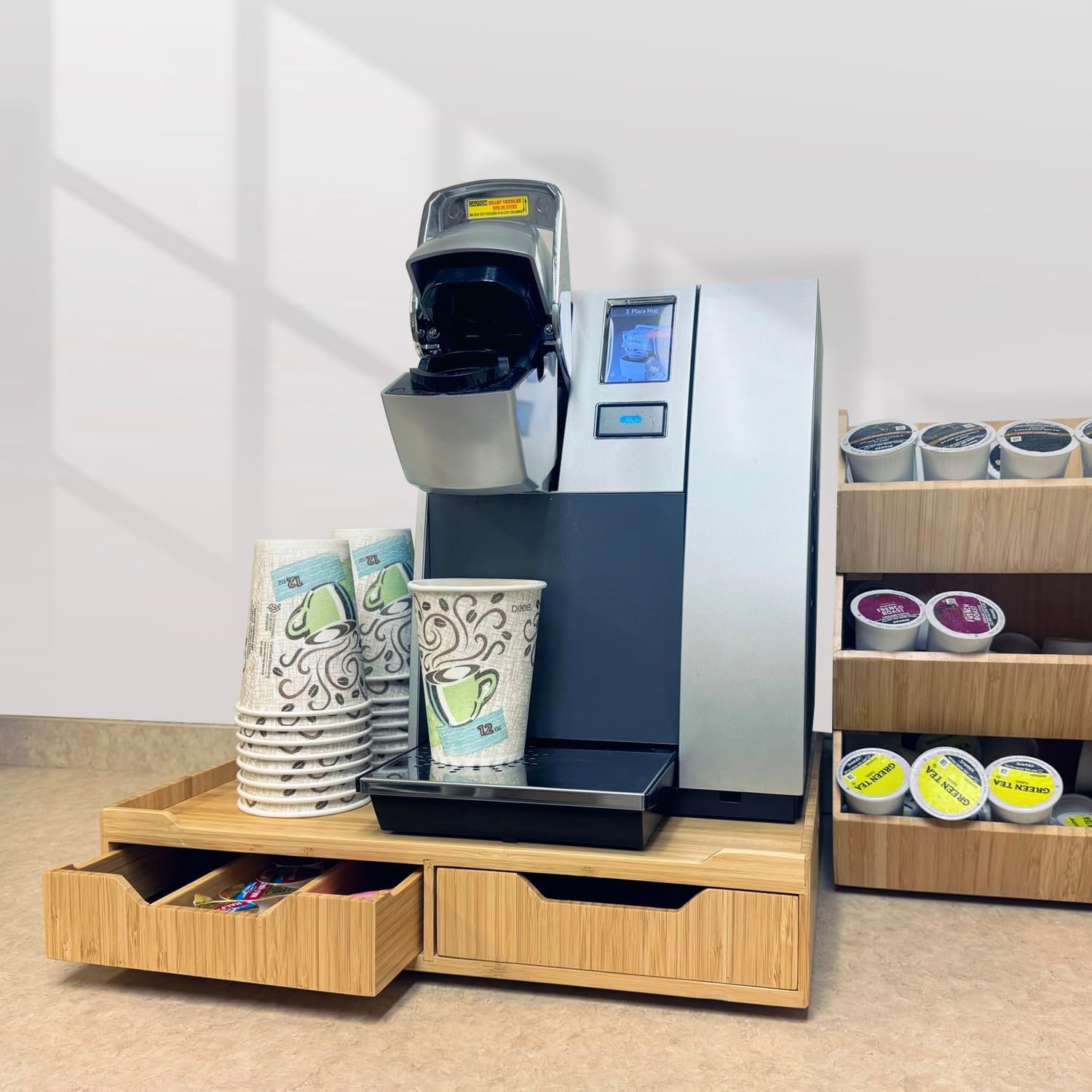 - [Organized Coffee Station] This bamboo drawer combo slider tray keeps your coffee and tea essentials neatly organized and easily accessible. Perfect for K-cups, espresso pods, tea bags, straws, stirrers, and other Coffee pods accessories. Set your appliance on top for a convenient, all-in-one coffee bar.