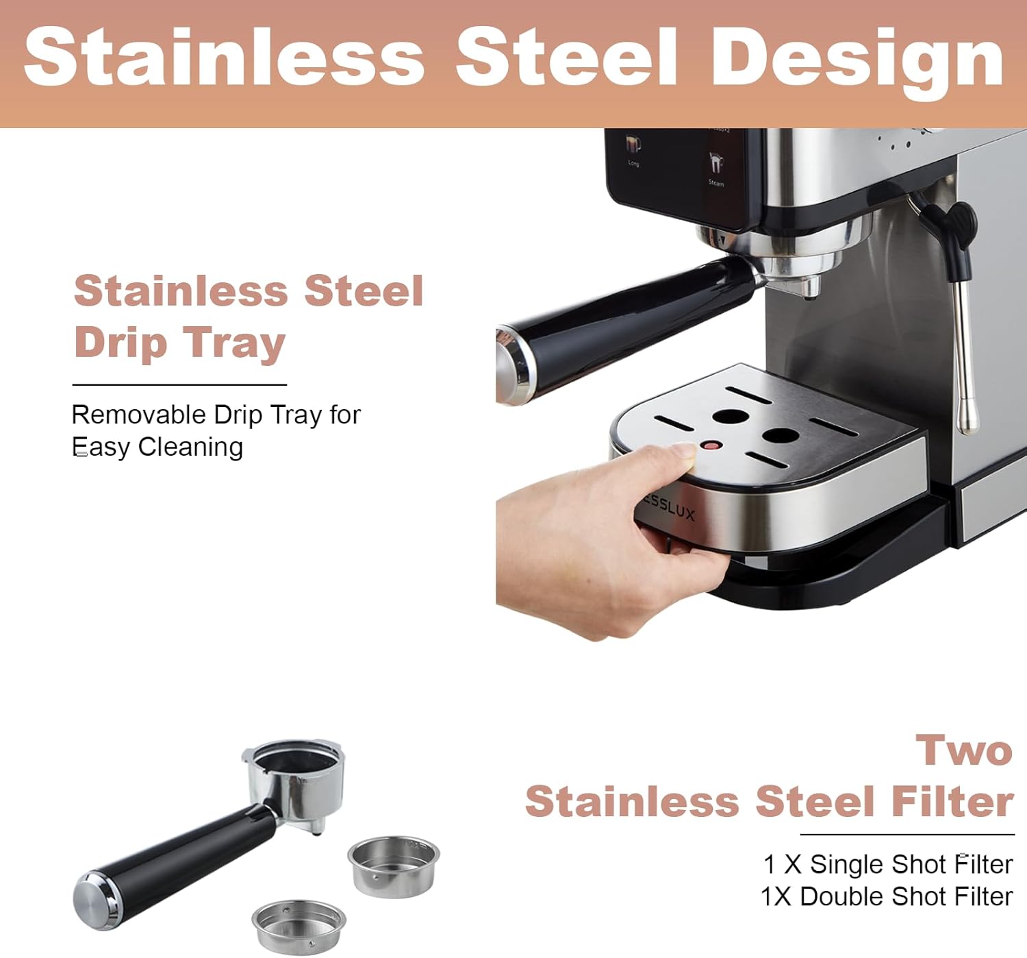 - 【Compact Design for Home Use】Featuring a space-saving stainless steel design, this espresso machine is perfect for small kitchens, combining style and practicality for home brewing.