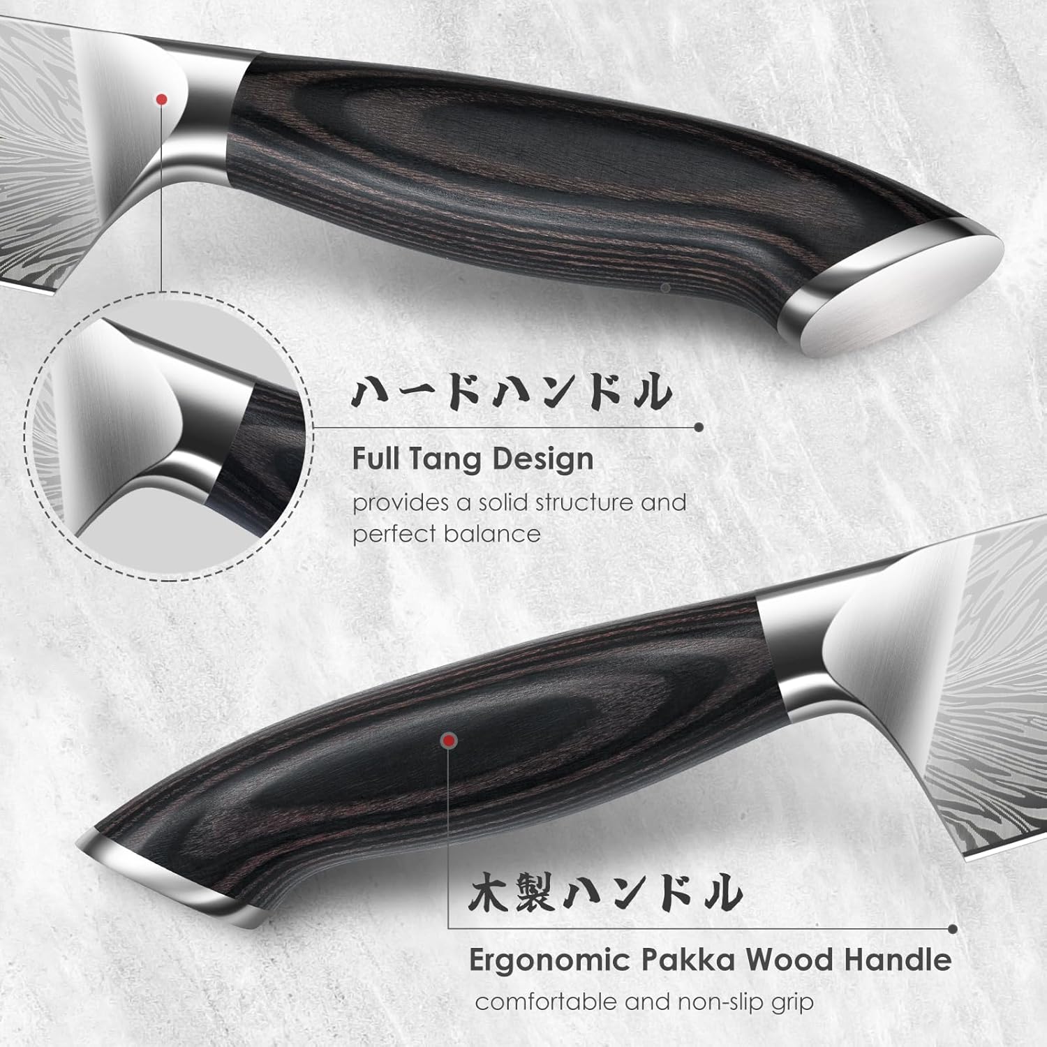 - [Ergonomic & Comfortable Wood Handle] The kitchen knives blade seamlessly integrates with a comfortable handle, providing you with a perfect grip. The ergonomic shape offers the right balance between handle and thin blade, ensuring easy maneuverability. Made of durable pakkawood, known for its excellent resistance, the handle is solid and ergonomically balanced