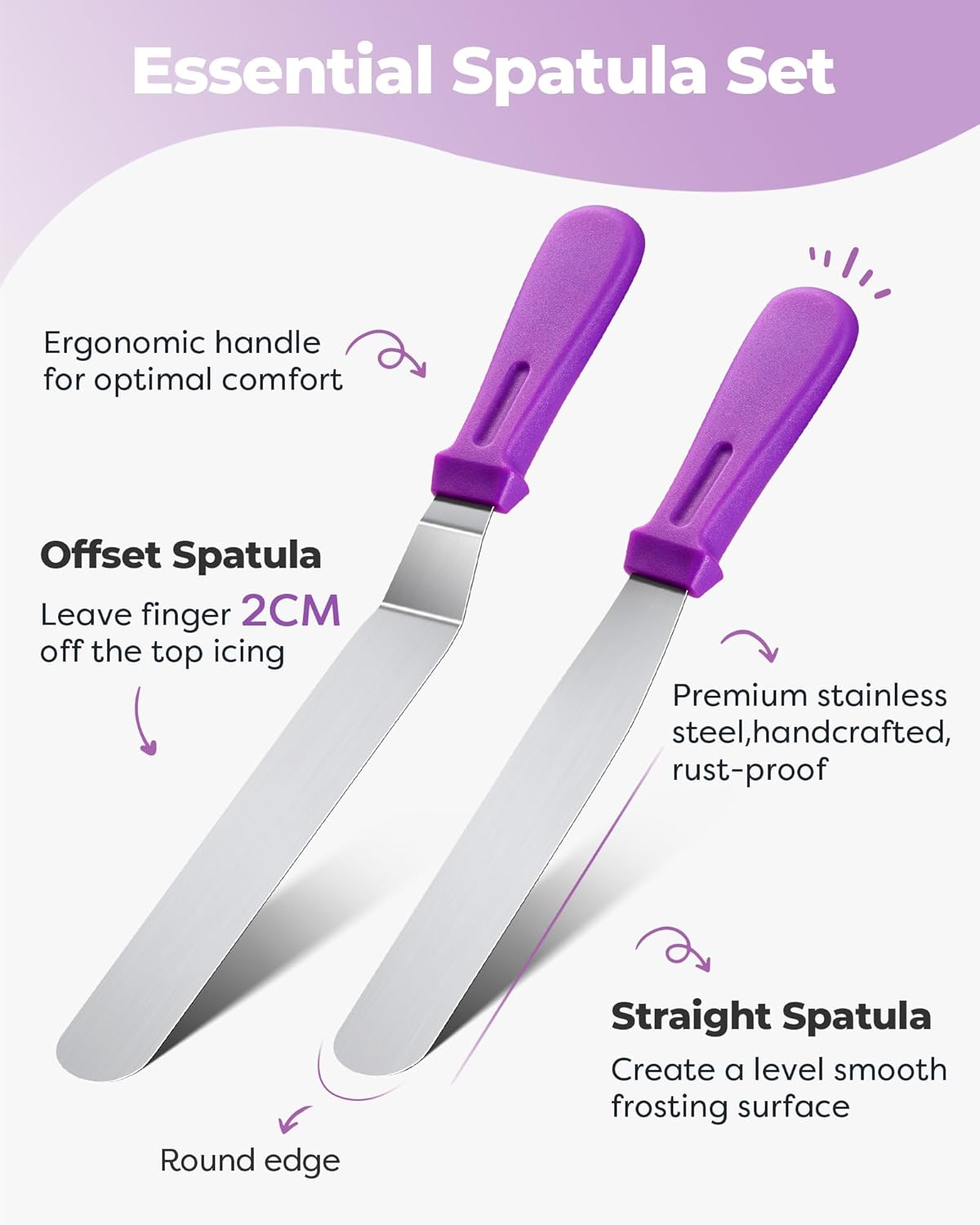 • Straight and Angled Frosting Spatulas: These high-quality stainless steel frosting spatulas make it easy to even out frosting and work on layered cakes. With a 12.5-inch angled spatula and a 10.6-inch straight spatula, you can create even crumb layers and perfect surfaces.