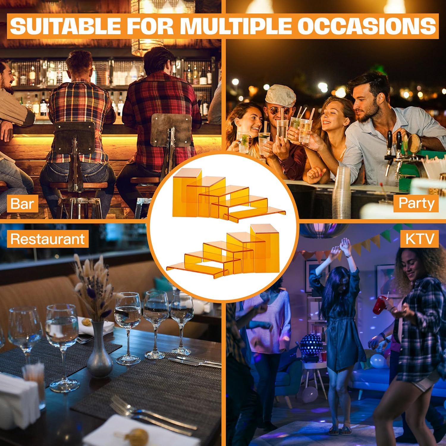 Goabroa Acrylic Display Risers, 2 Sets 5 Tier Rectangular Risers Display Stands, Acrylic Display Shelves for Figures, Cupcake, Perfume Display, Transparent Orange