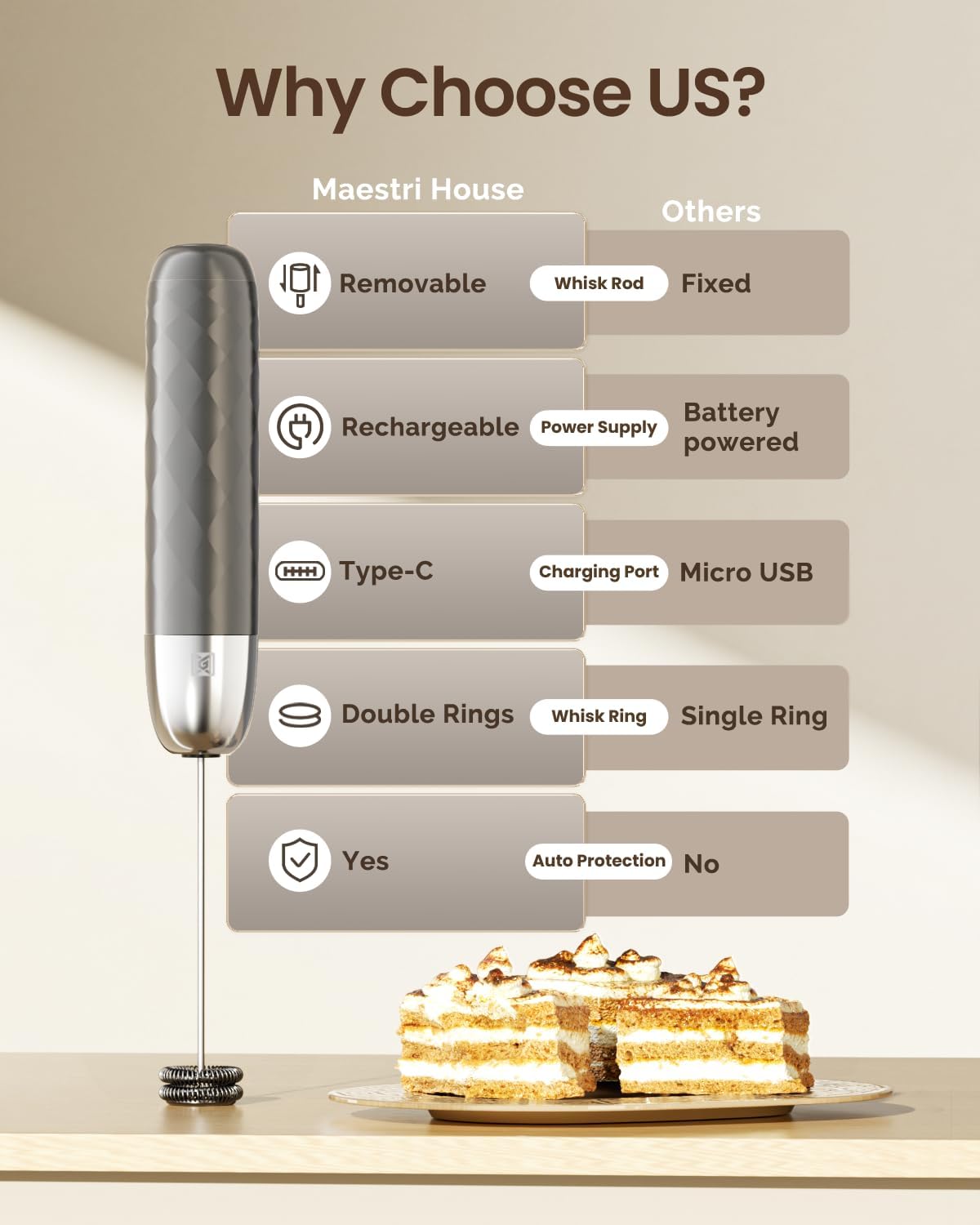 Maestri House Rechargeable Milk Frother, LunaFro Mini Handheld Electric Foam Maker Detachable Stainless Steel Whisk Drink Mixer Foamer Mini Blender for Matcha, Lattes, Cappuccino, No Stand