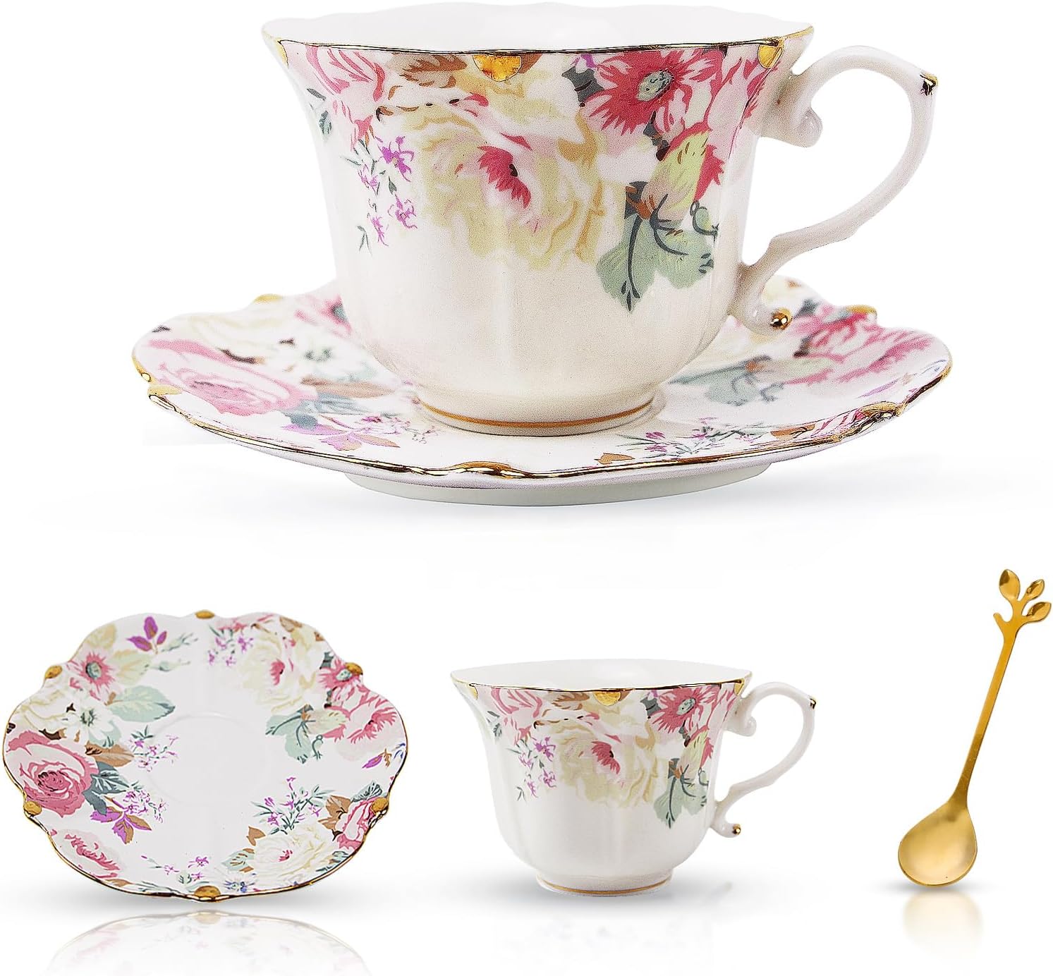 - 8.5 Ounce Bone China Porcelain Tea Cup and Saucer, Assorted colors, Floral Pattern, Set of 1