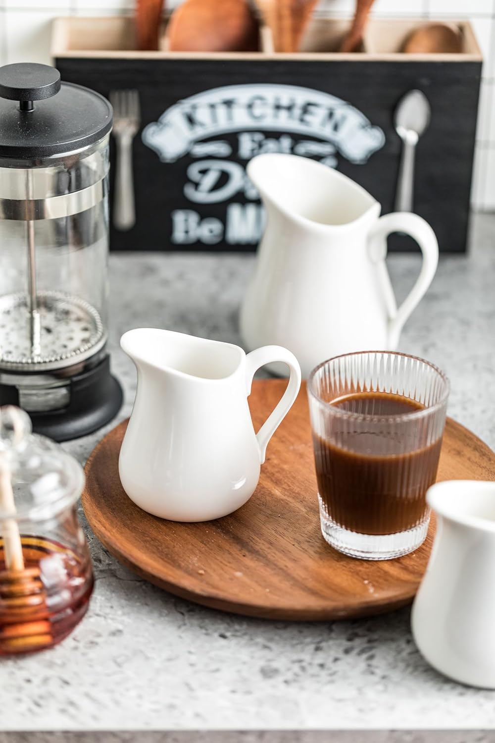 - Design Concept: Classic white style and simple design. The creamer pitcher with handle most basic kitchen accessories and decor nicely. It is very suitable for restaurants, families, coffee shops and other occasions. ceramics cream pitcher is a great choice for gifts.