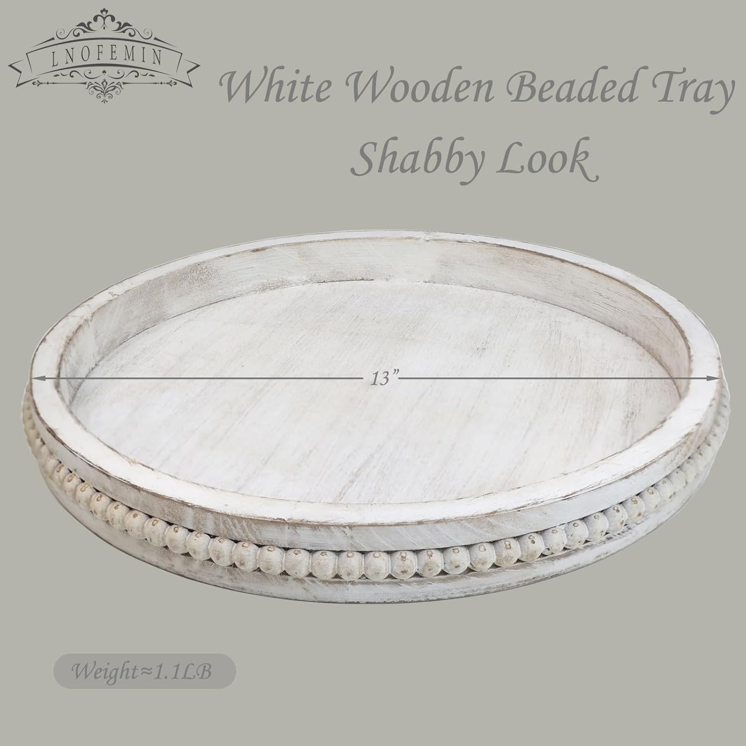 Round Wood Serving Tray with Beads, White Washed Wooden Decorative Tray for Entertaining, Decoration, and Gifting